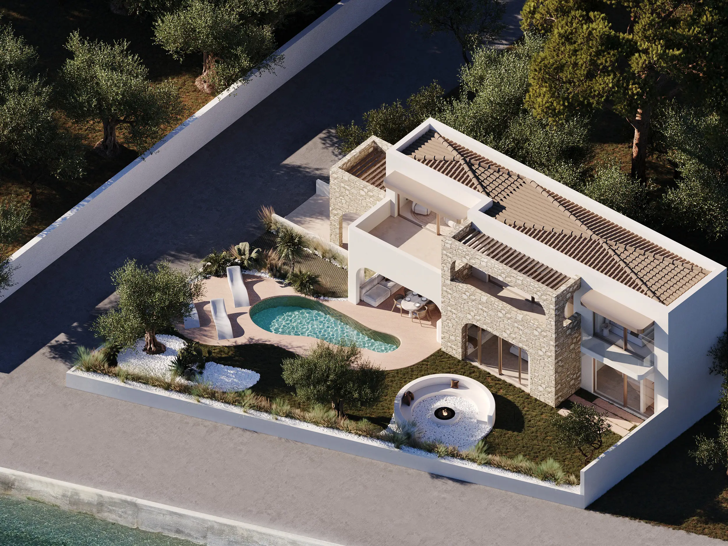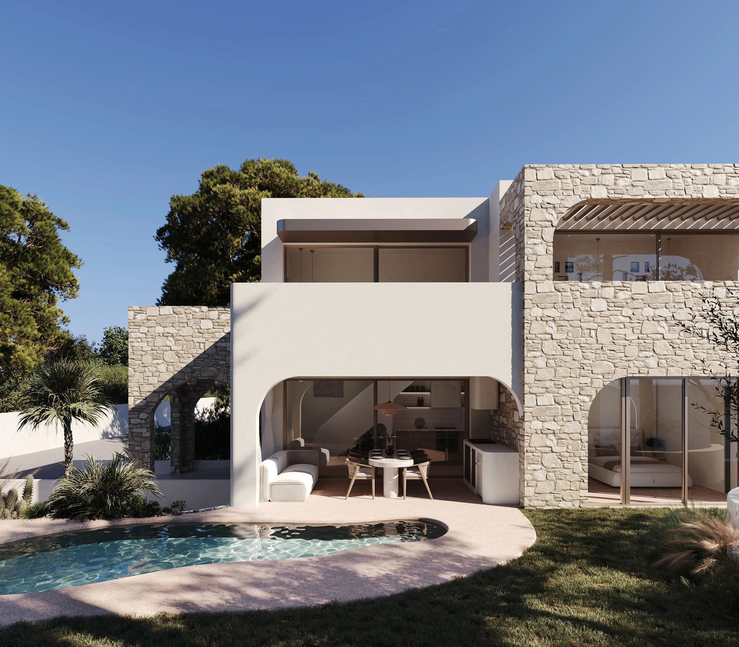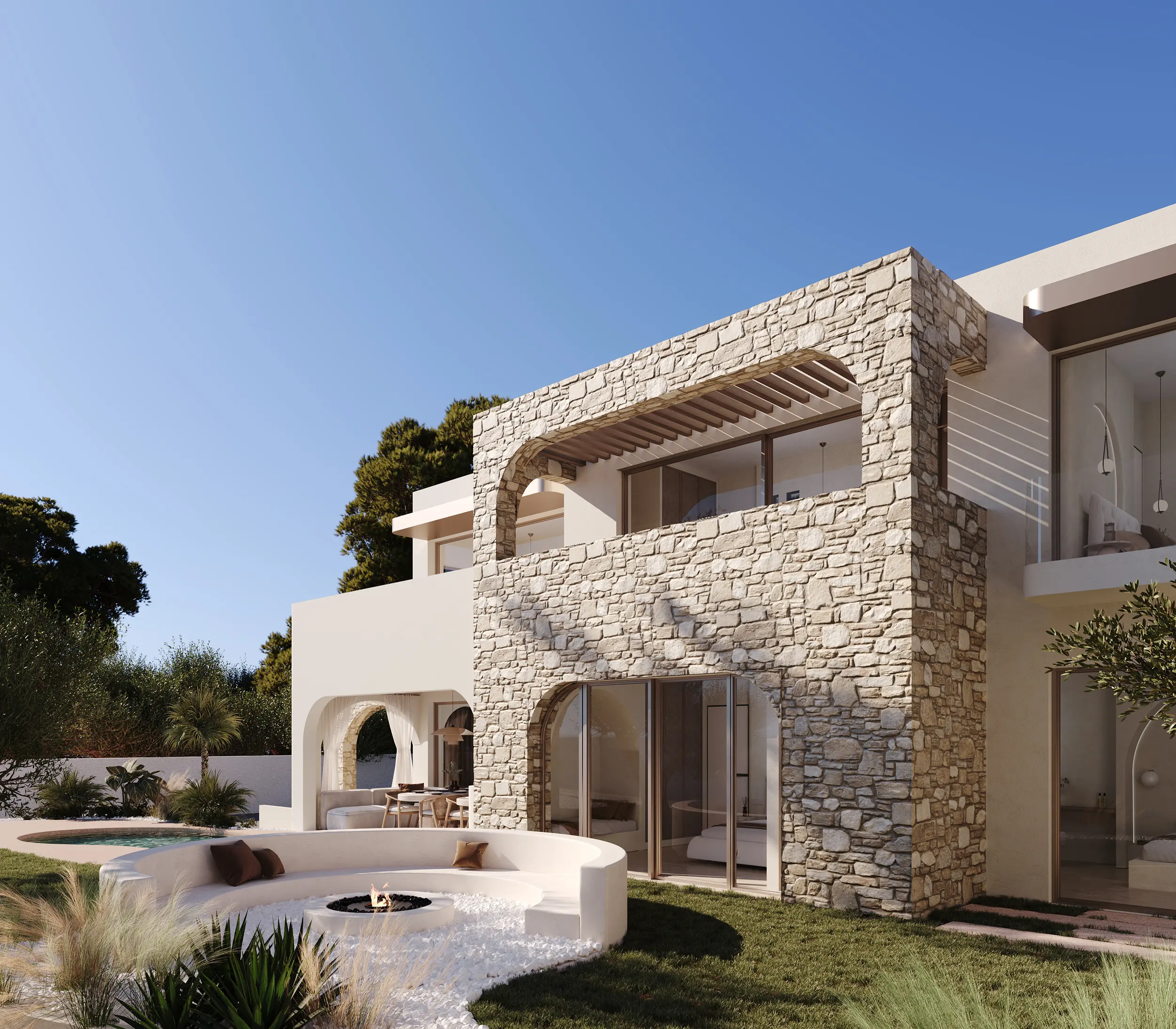 Στην καρδιά του συγκροτήματος οργανώνεται ο κεντρικός αύλιος χώρος, όπου ο οργανικός χαρακτήρας των όψεων συνεχίζεται στις διαμορφώσεις του περιβάλλοντα χώρου. Η κολυμβητική δεξαμενή, οι ημιυπαίθριες ζώνες σκίασης και το lounge area σε υποχώρηση συνθέτουν μια φυσική ροή που ενώνει το “μέσα” με το “έξω”, ενισχύοντας την αίσθηση χαλάρωσης και ανεπιτήδευτης πολυτέλειας.