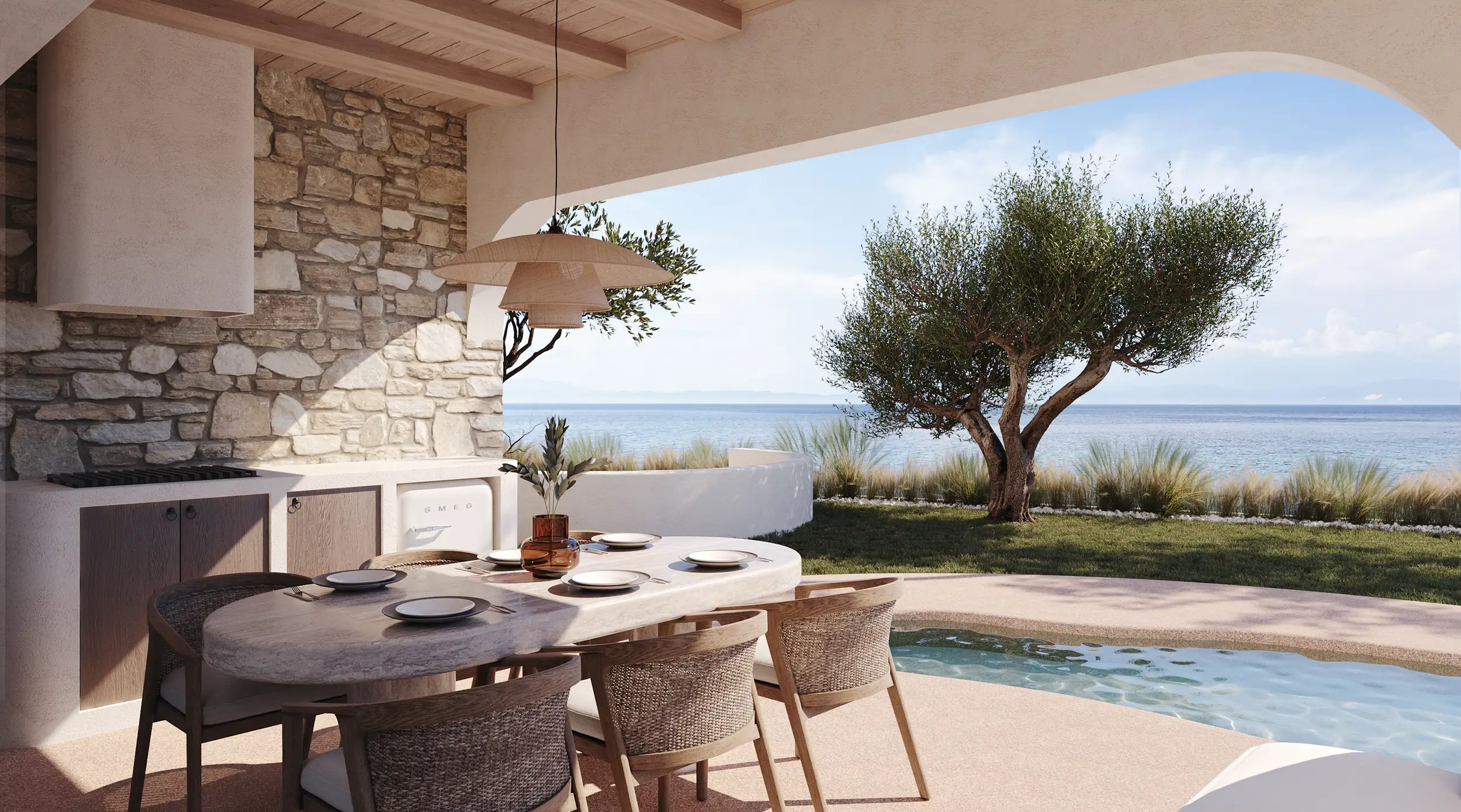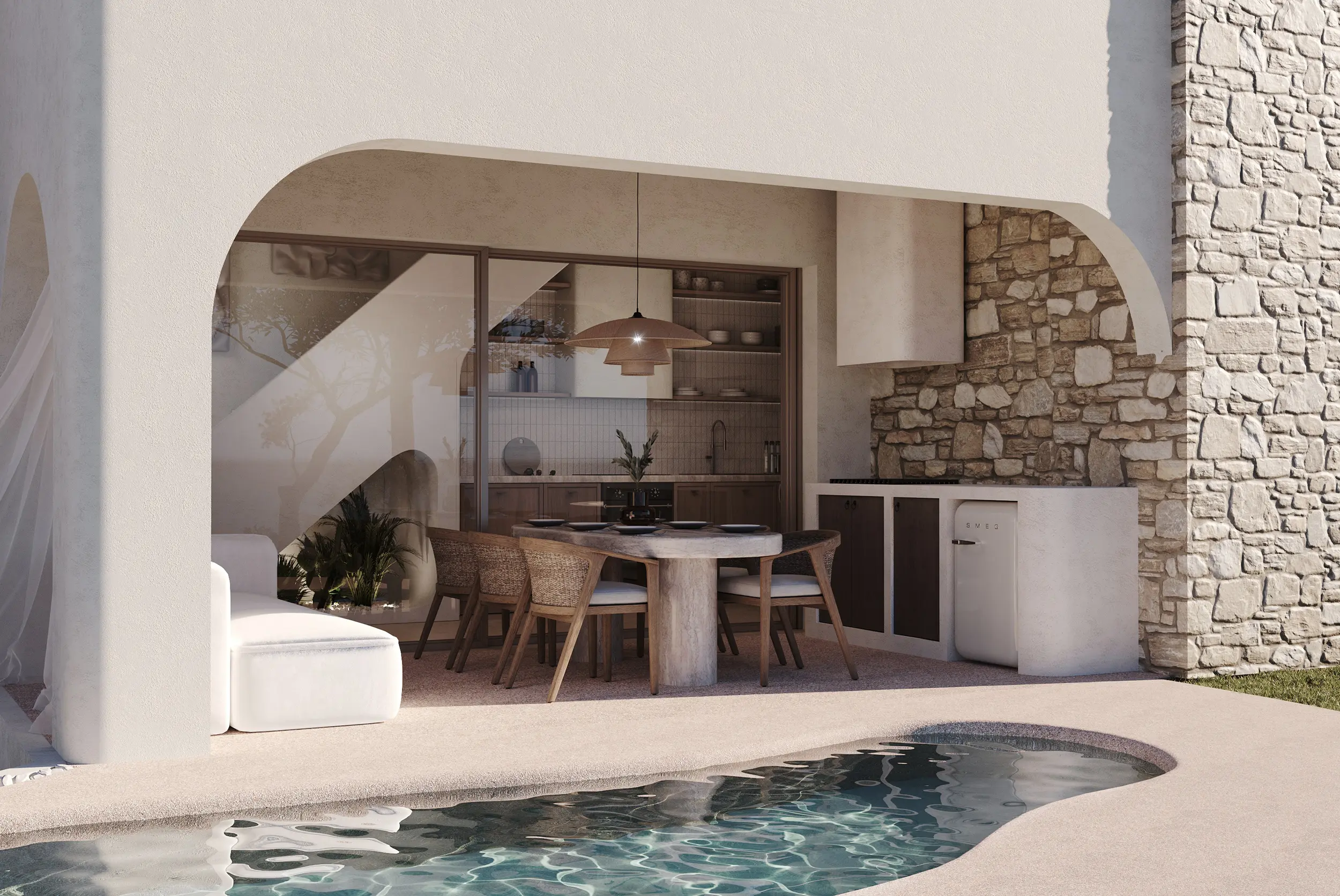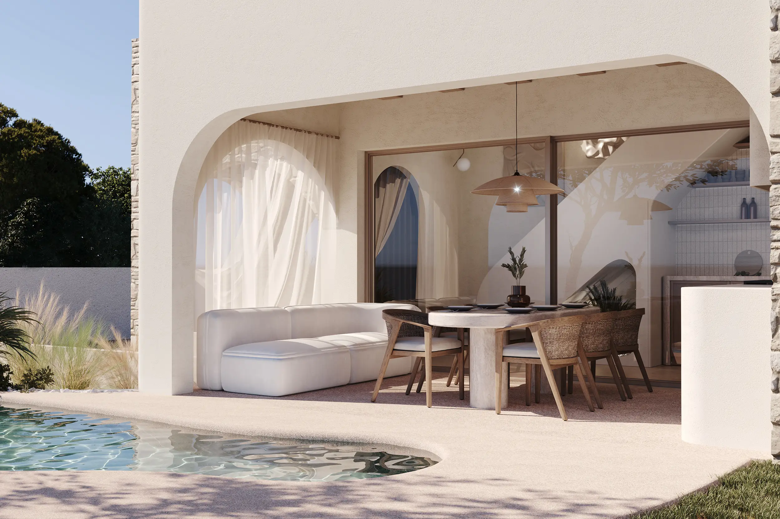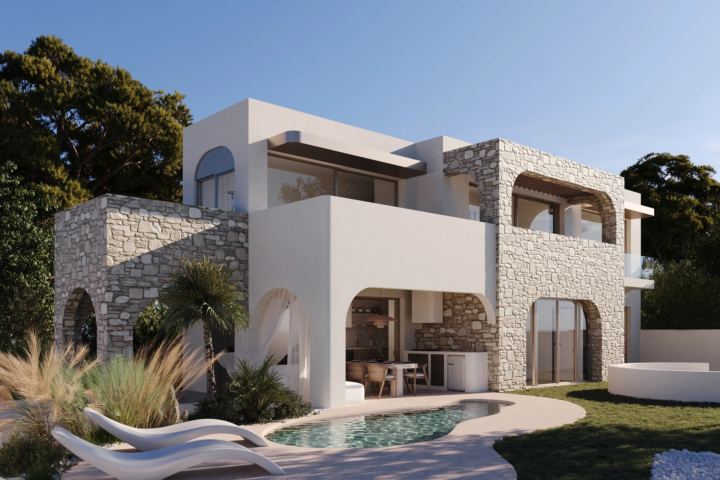 Στην καρδιά του συγκροτήματος οργανώνεται ο κεντρικός αύλιος χώρος, όπου ο οργανικός χαρακτήρας των όψεων συνεχίζεται στις διαμορφώσεις του περιβάλλοντα χώρου. Η κολυμβητική δεξαμενή, οι ημιυπαίθριες ζώνες σκίασης και το lounge area σε υποχώρηση συνθέτουν μια φυσική ροή που ενώνει το “μέσα” με το “έξω”, ενισχύοντας την αίσθηση χαλάρωσης και ανεπιτήδευτης πολυτέλειας.