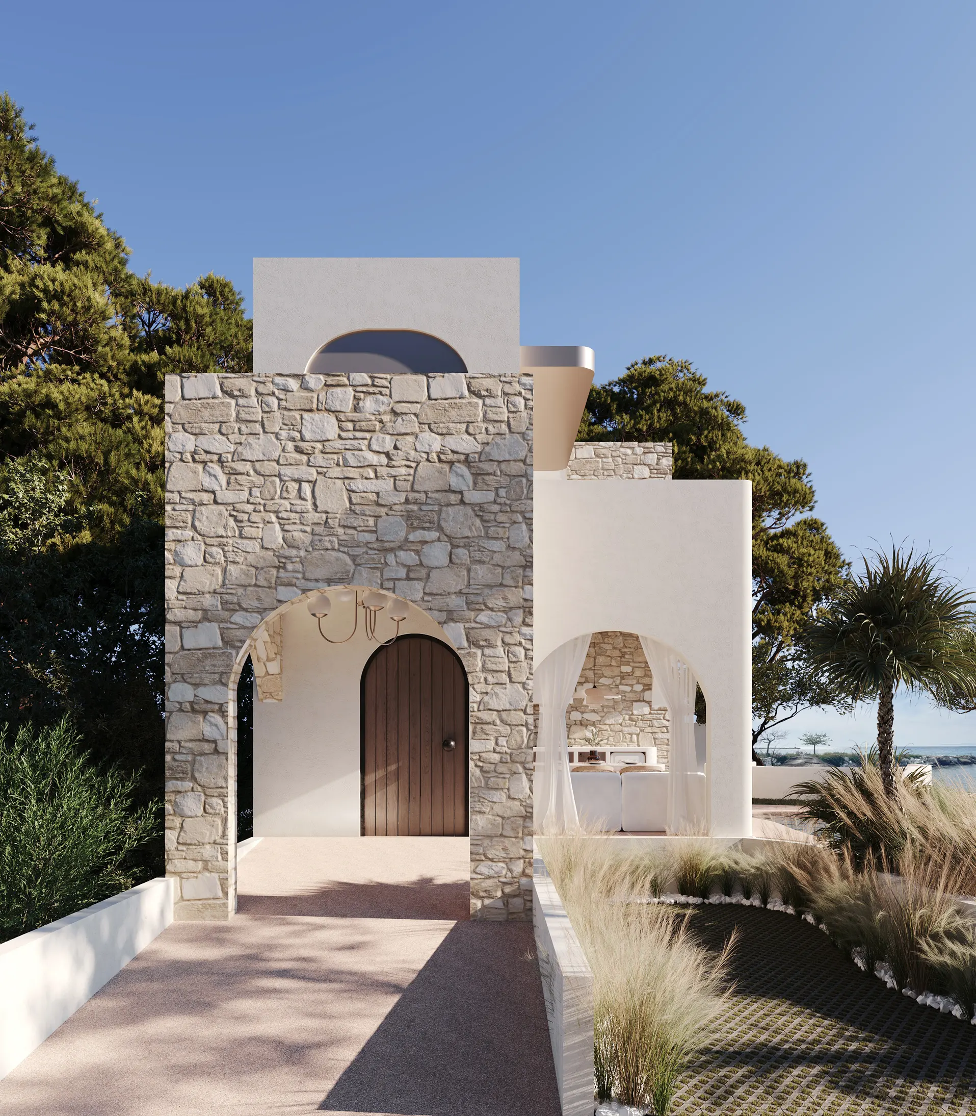 Τρεις κύριοι όγκοι παρατάσσονται παράλληλα, ενώ οι λιθόκτιστες προσθήκες λειτουργούν ως “ανάγλυφα” στοιχεία που προσδίδουν βάθος, υφή και ουσιαστική σύνδεση με το τοπίο. Τα υπερμεγέθη υαλοστάσια εξασφαλίζουν ανεμπόδιστη θέα προς το υδάτινο στοιχείο, επιτρέποντας στο φως και στον ορίζοντα να εισέρχονται στο εσωτερικό ως αναπόσπαστο μέρος της καθημερινής εμπειρίας του επισκέπτη.