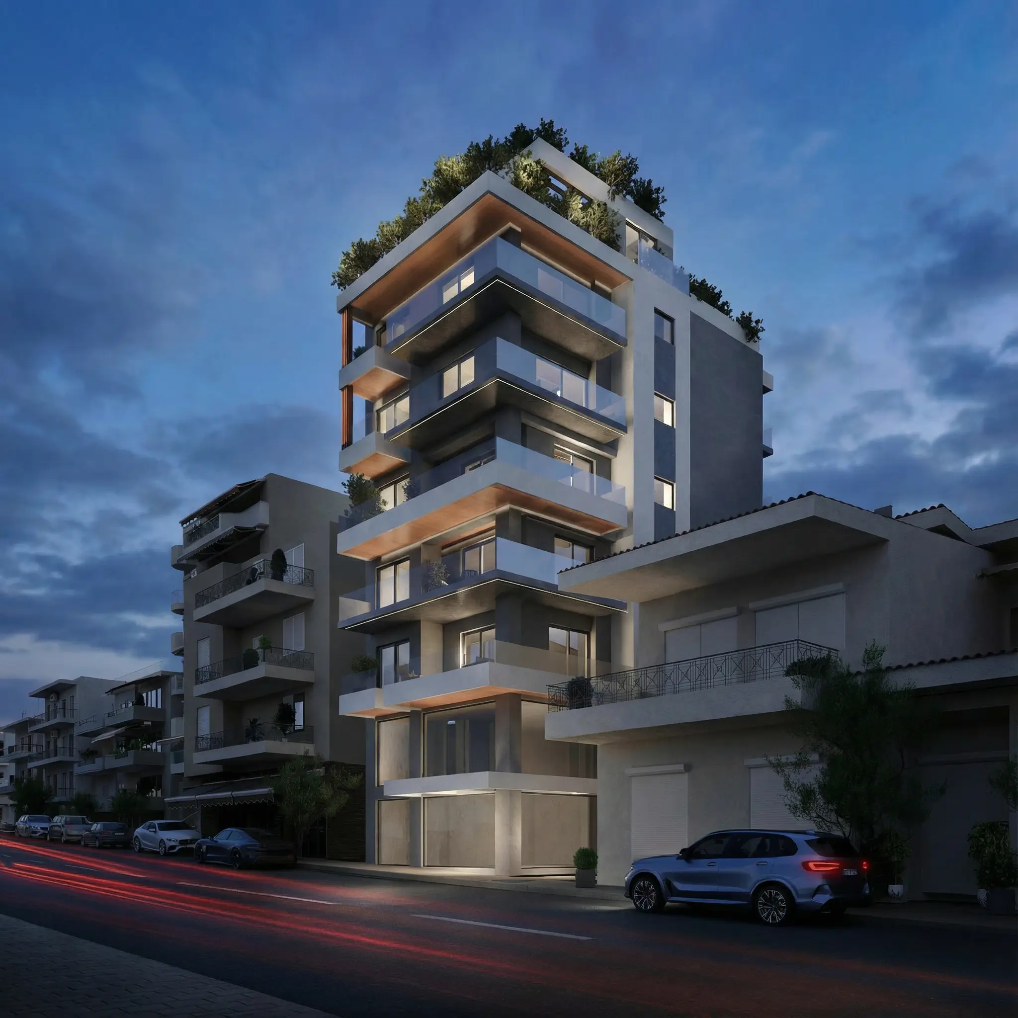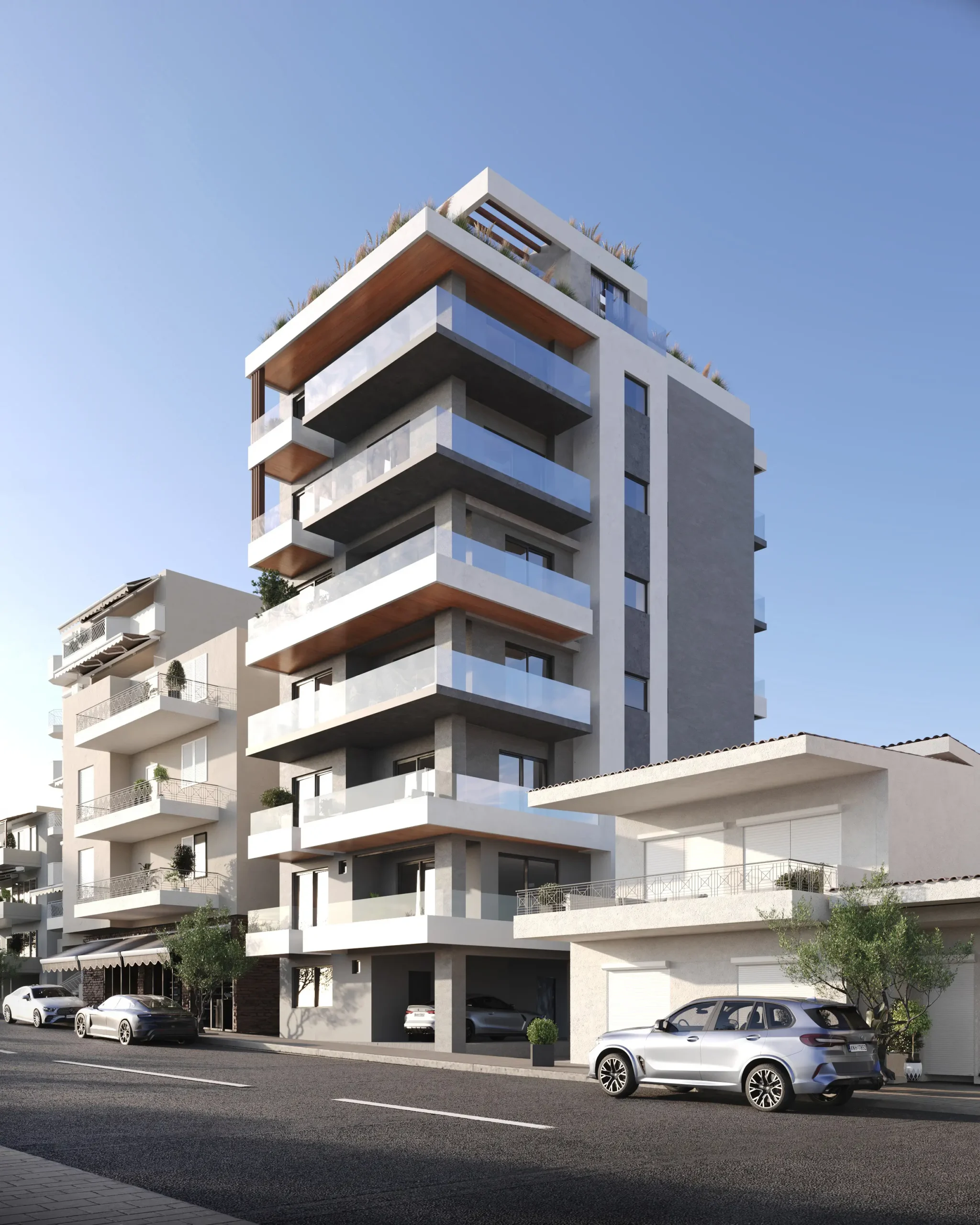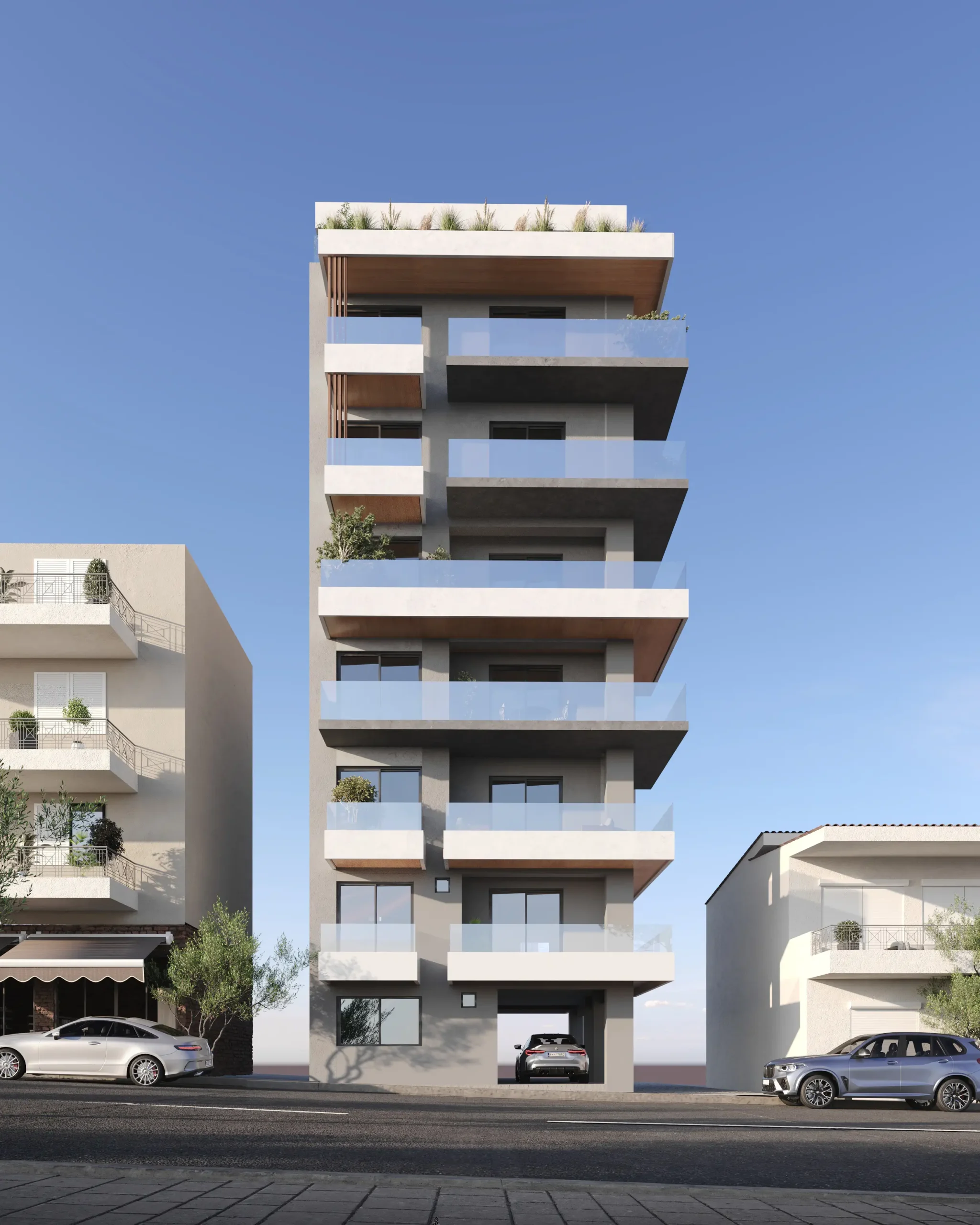Οι υπερμεγέθης εξώστες λειτουργούν ως προέκταση της καθημερινής ζωής, προσφέροντας πανοραμικές θέες προς την πόλη και τη θάλασσα και ενισχύοντας τη σχέση του εσωτερικού με το αστικό τοπίο. Η επένδυση των οροφών των εξωστών με ξύλινα στοιχεία deck εισάγει θερμότητα και υλικότητα στο εξωτερικό κέλυφος, ισορροπώντας τον δυναμισμό της δίχρωμης σύνθεσης με μια πιο ανθρώπινη, φυσική αίσθηση. Ιδιαίτερη έμφαση δίνεται στο τελευταίο επίπεδο, όπου διαμορφώνονται ευρύχωροι καθιστικοί χώροι που πλαισιώνονται από επιμελημένες φυτεύσεις.