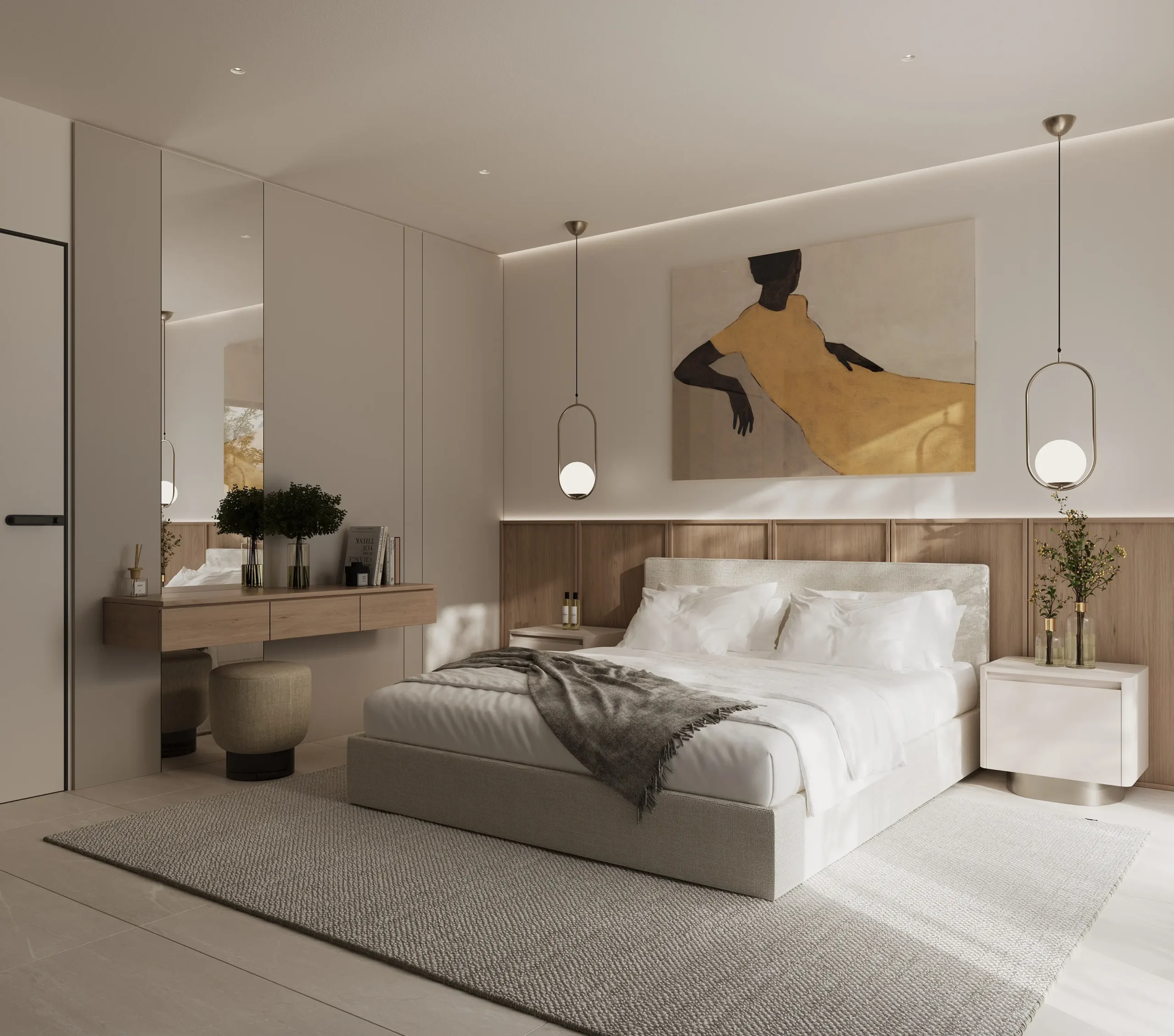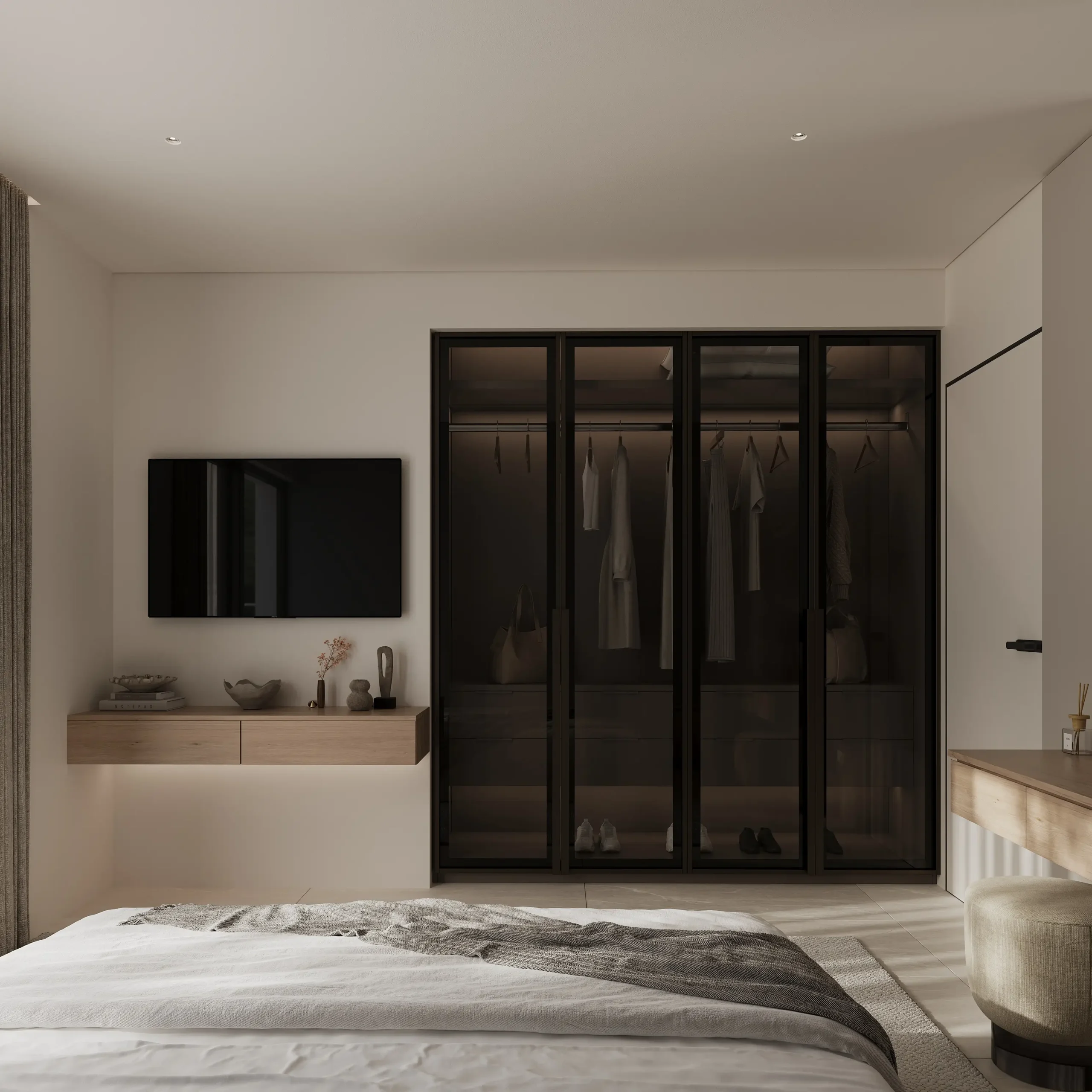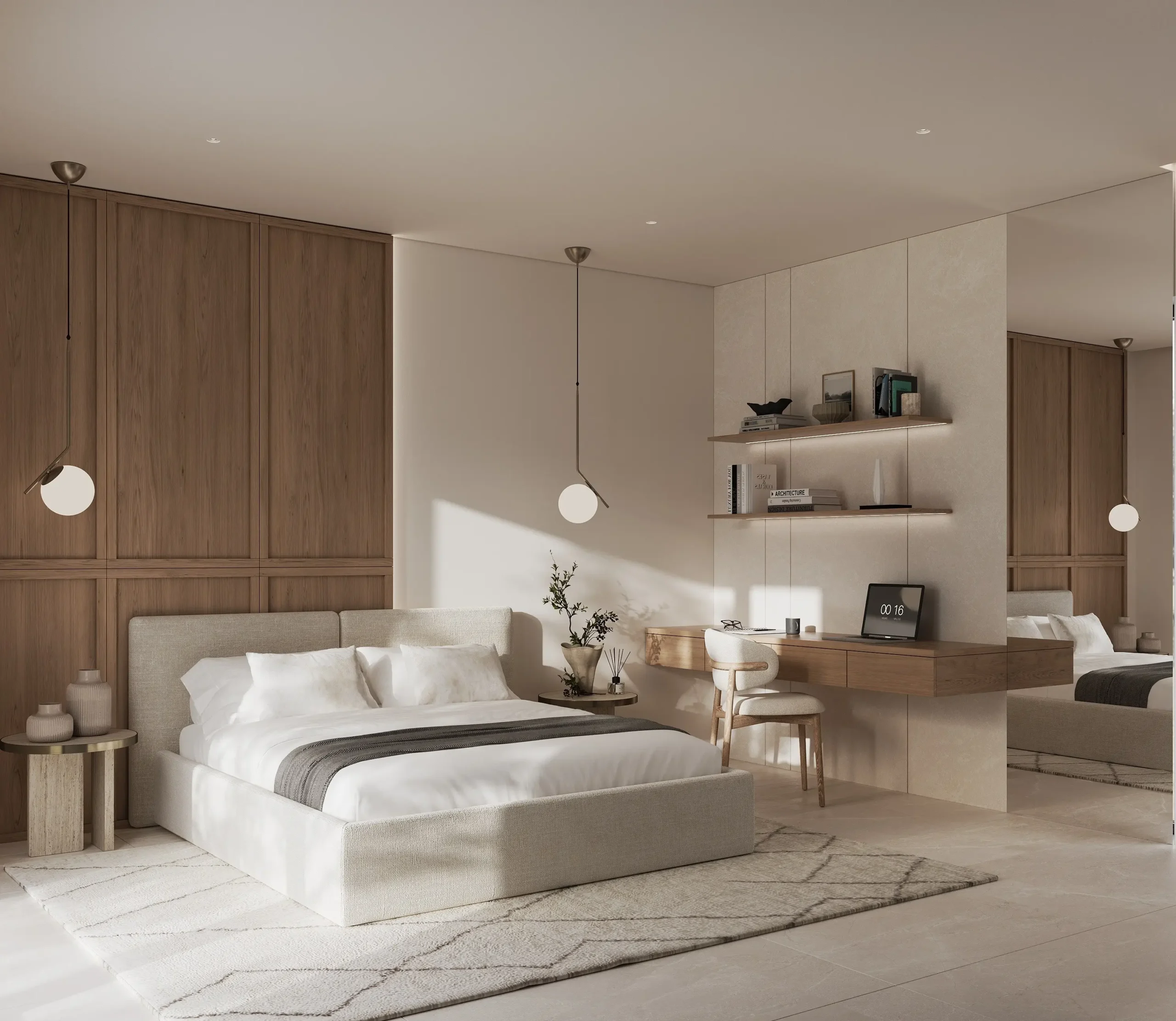 Στους ιδιωτικούς χώρους, η σχεδιαστική προσέγγιση παραμένει λιτή και ουσιαστική. Τα υπνοδωμάτια διαμορφώνονται ως καταφύγια χαλάρωσης, με έμφαση στη λειτουργικότητα, τις custom ξύλινες κατασκευές και τη διακριτική χρήση φωτισμού. Τα λουτρά ολοκληρώνουν τη συνολική αρχιτεκτονική αφήγηση, μέσα από stone και marble επιφάνειες, minimal λεπτομέρειες και μια αίσθηση spa-like εμπειρίας.