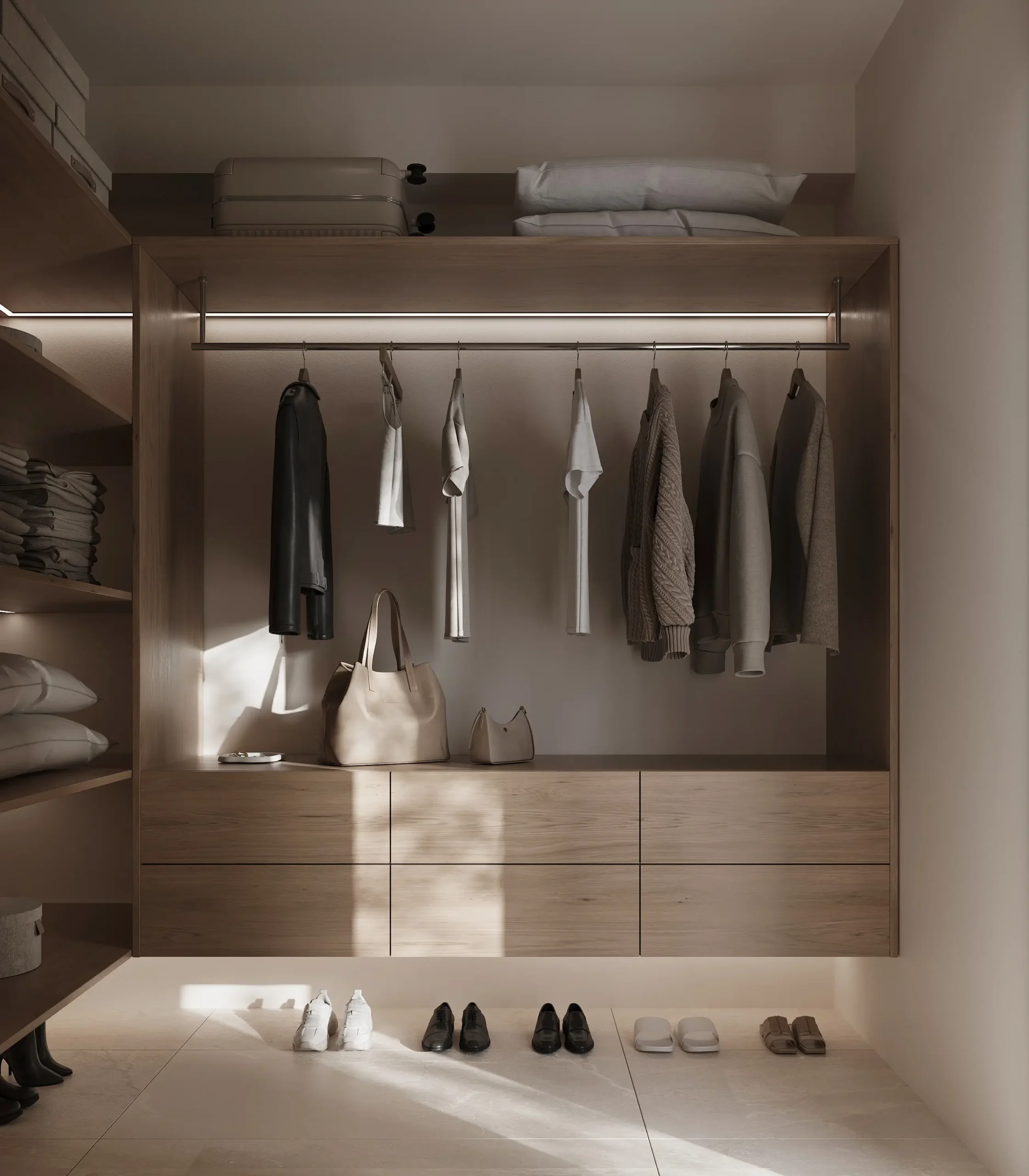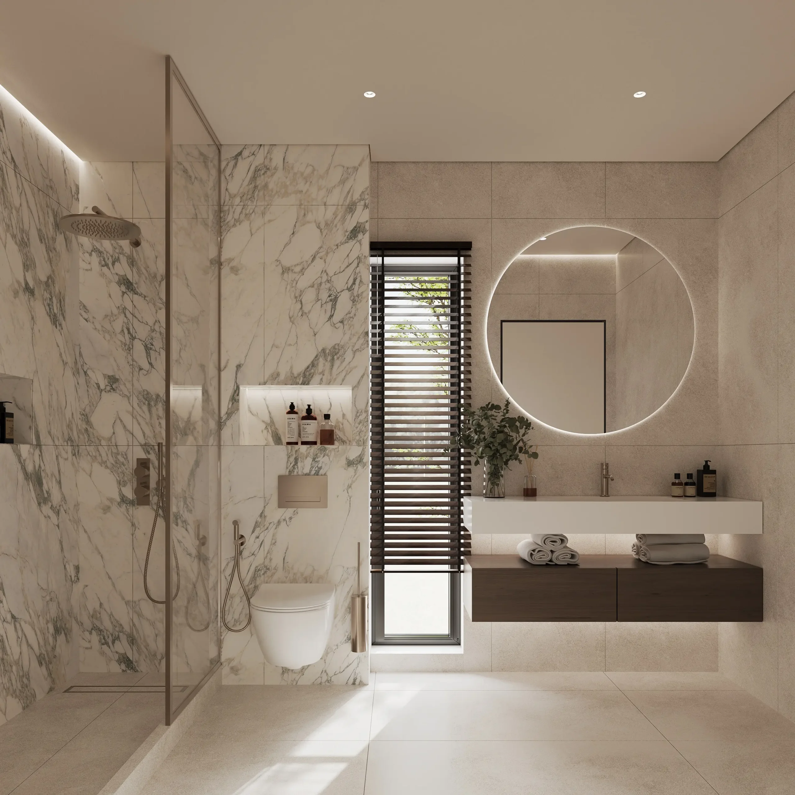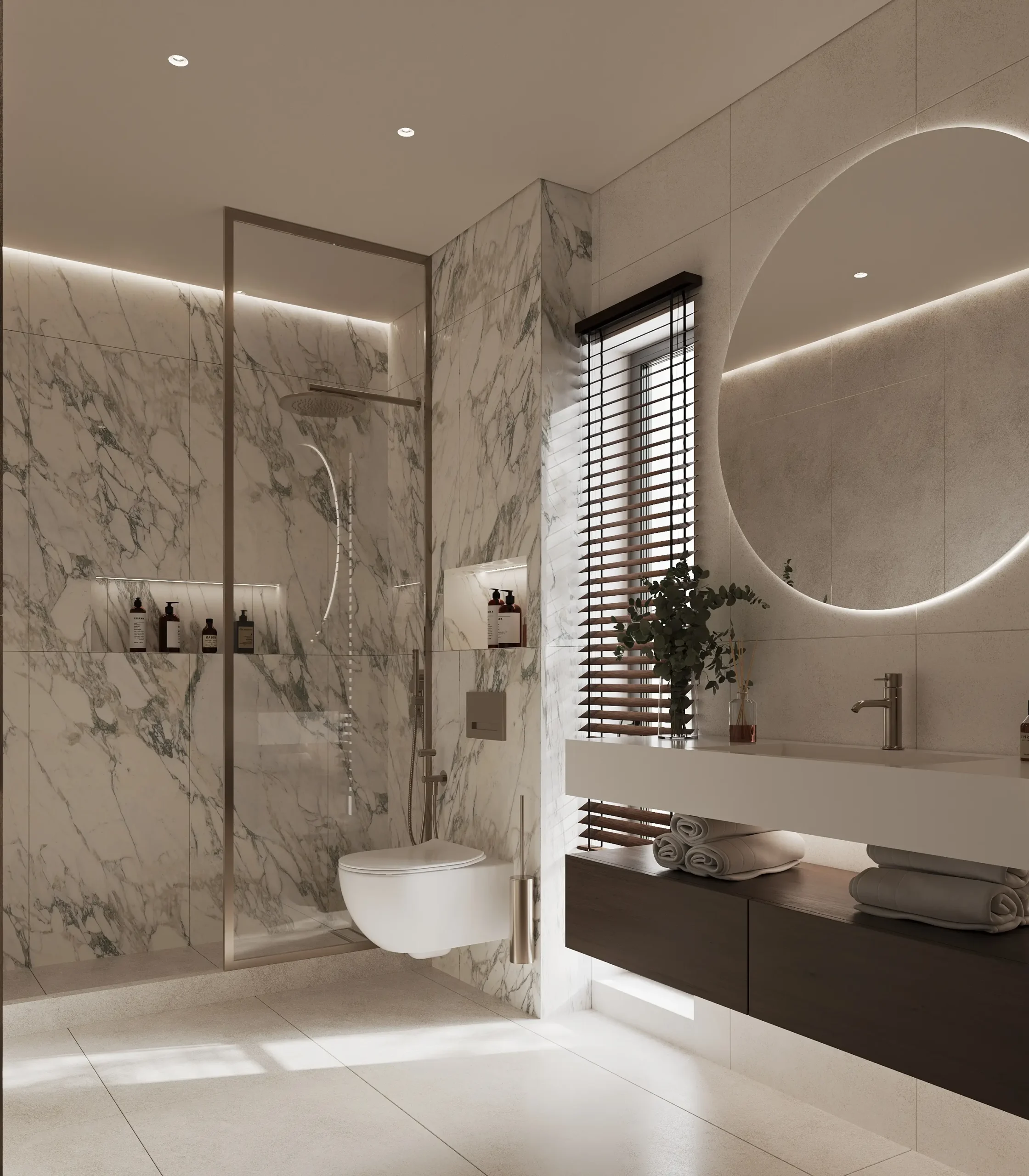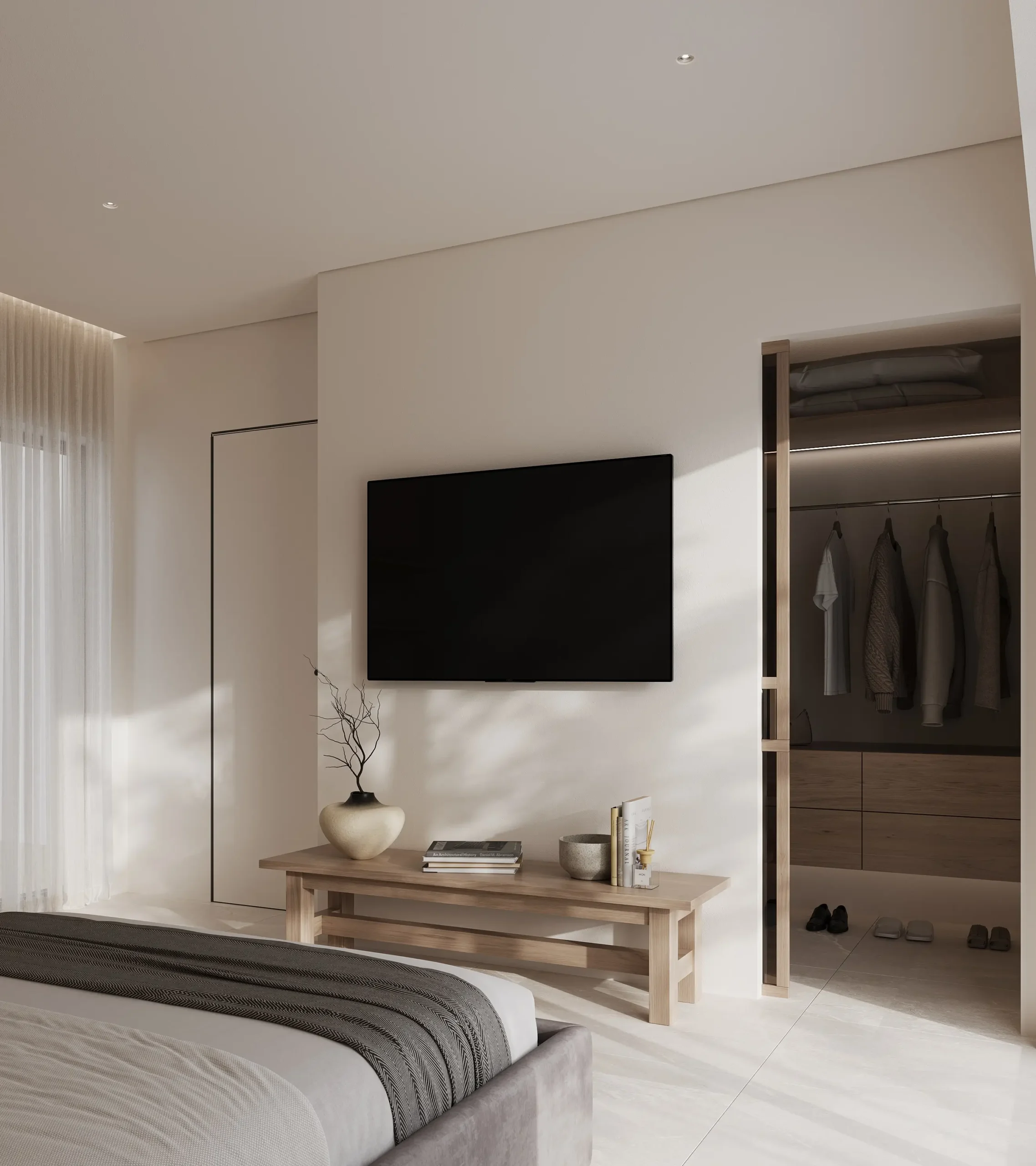 Στους ιδιωτικούς χώρους, η σχεδιαστική προσέγγιση παραμένει λιτή και ουσιαστική. Τα υπνοδωμάτια διαμορφώνονται ως καταφύγια χαλάρωσης, με έμφαση στη λειτουργικότητα, τις custom ξύλινες κατασκευές και τη διακριτική χρήση φωτισμού. Τα λουτρά ολοκληρώνουν τη συνολική αρχιτεκτονική αφήγηση, μέσα από stone και marble επιφάνειες, minimal λεπτομέρειες και μια αίσθηση spa-like εμπειρίας.