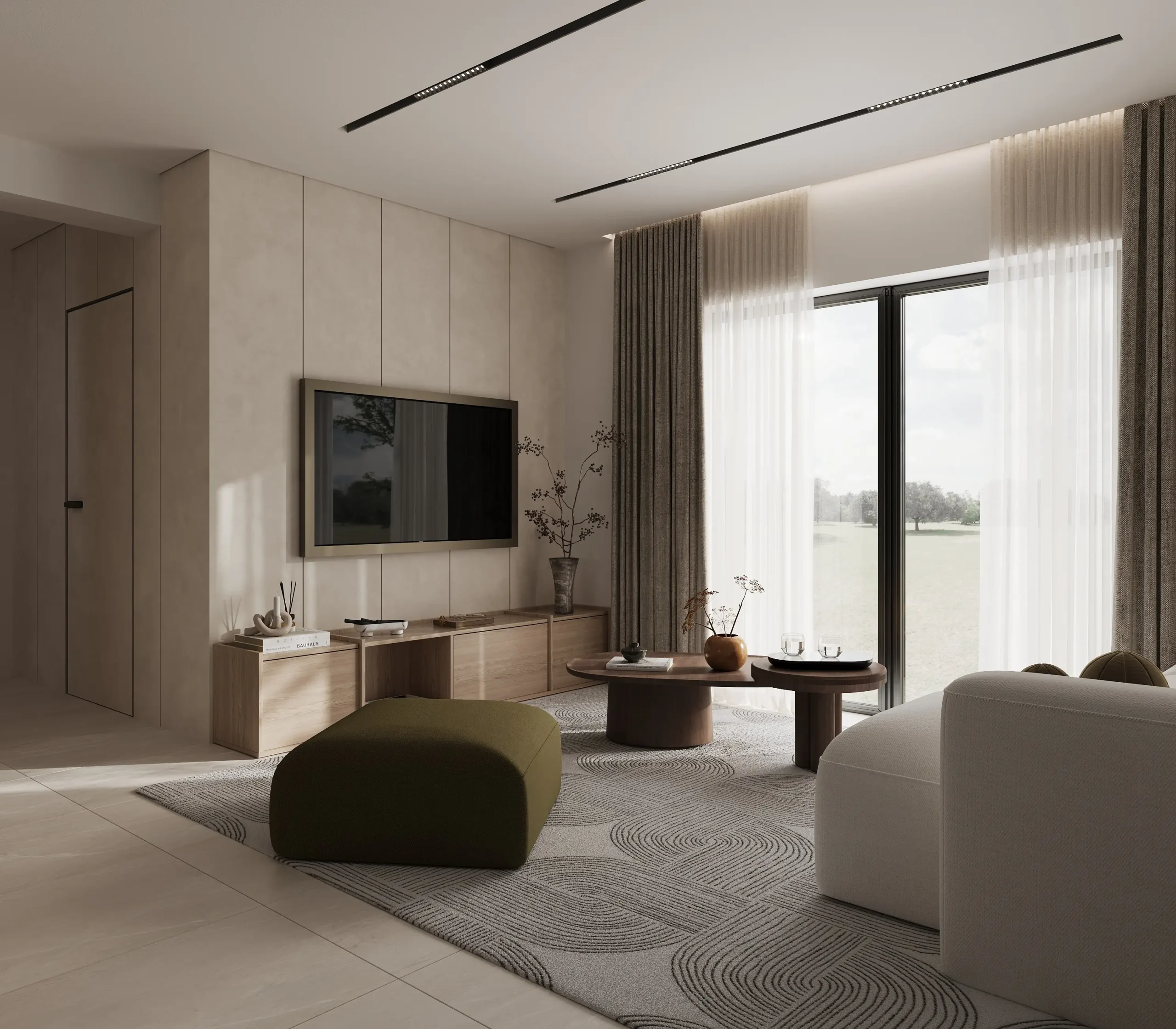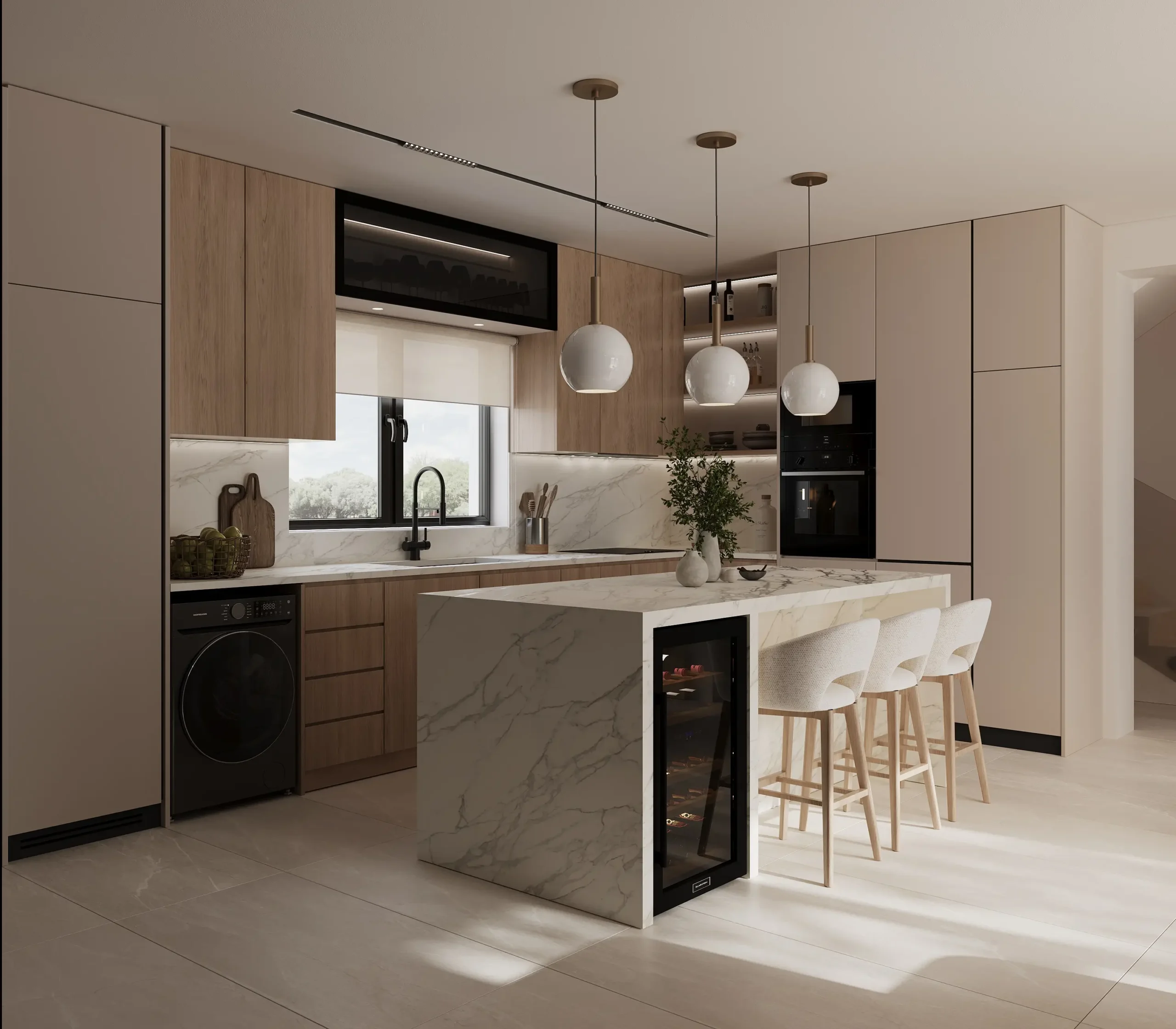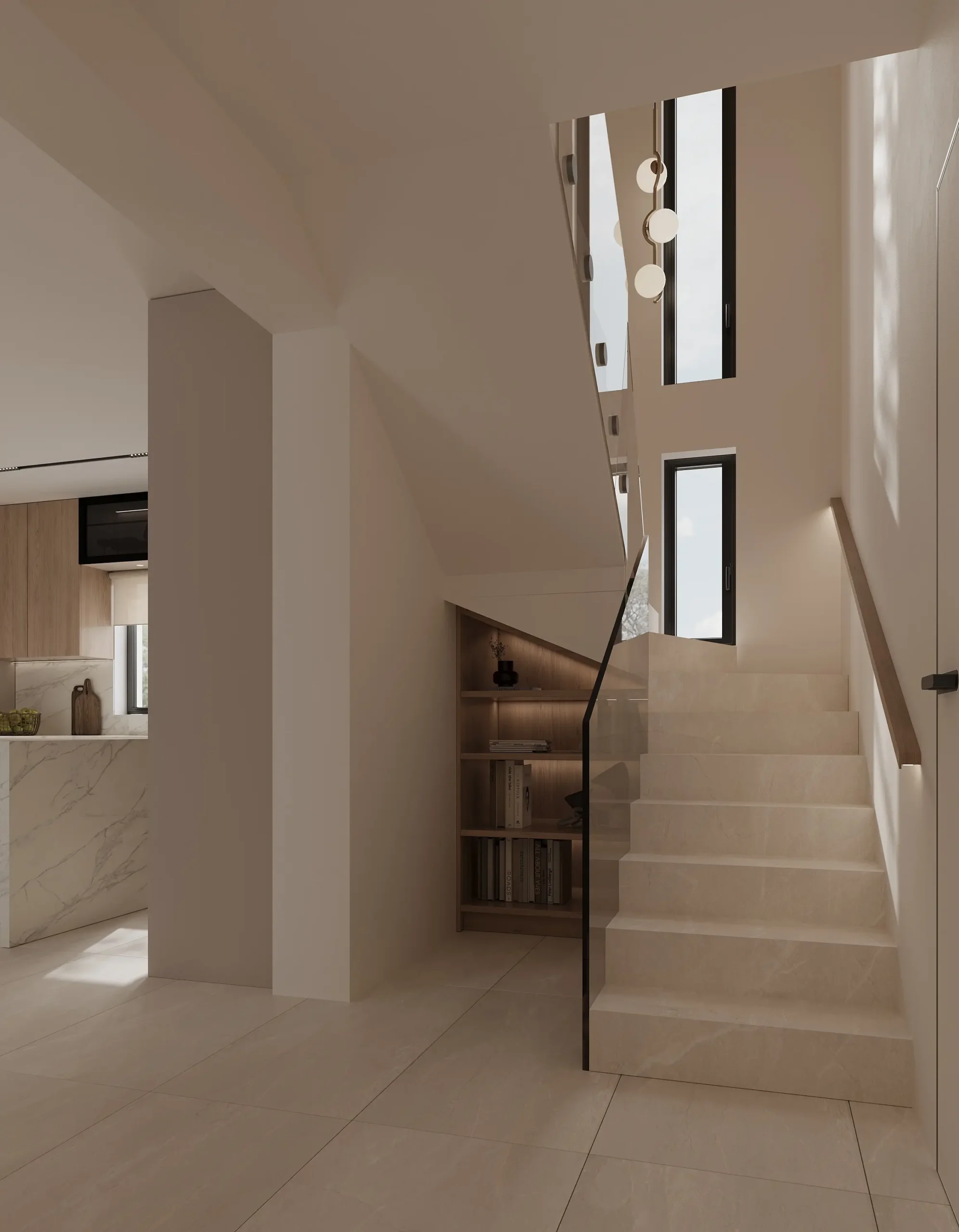 Ο ενιαίος χώρος καθιστικού και κουζίνας οργανώνεται με καθαρές γραμμές και ήπιες γεωμετρικές χειρονομίες, όπου το μαρμάρινο νησί λειτουργεί ως κεντρικό σημείο αναφοράς. Το φυσικό φως αξιοποιείται ως βασικό αρχιτεκτονικό εργαλείο, ενισχύοντας τη χρωματική παλέτα και αναδεικνύοντας τις υφές των υλικών, ενώ ο κρυφός και γραμμικός φωτισμός προσθέτει βάθος και αίσθηση ηρεμίας στους χώρους.