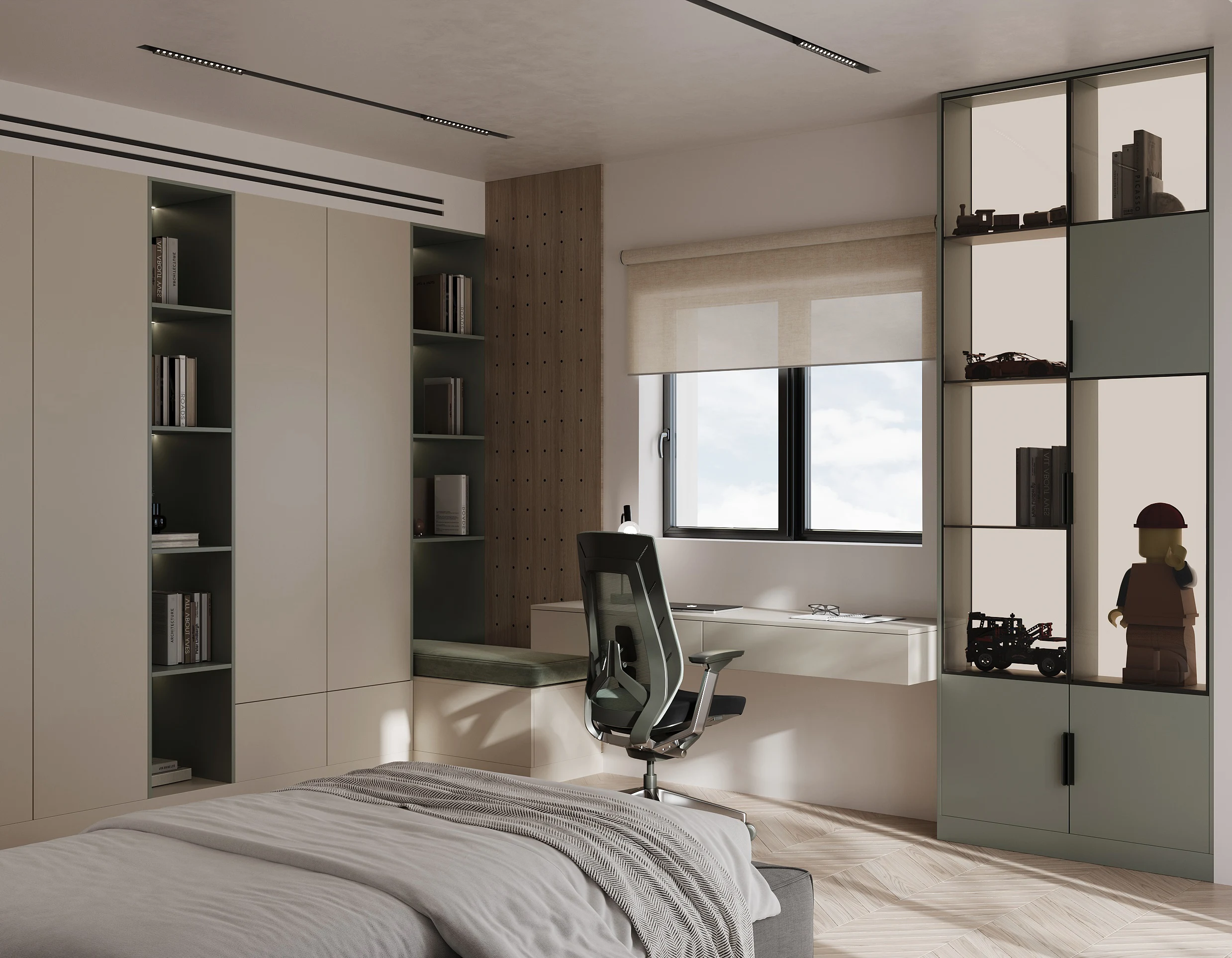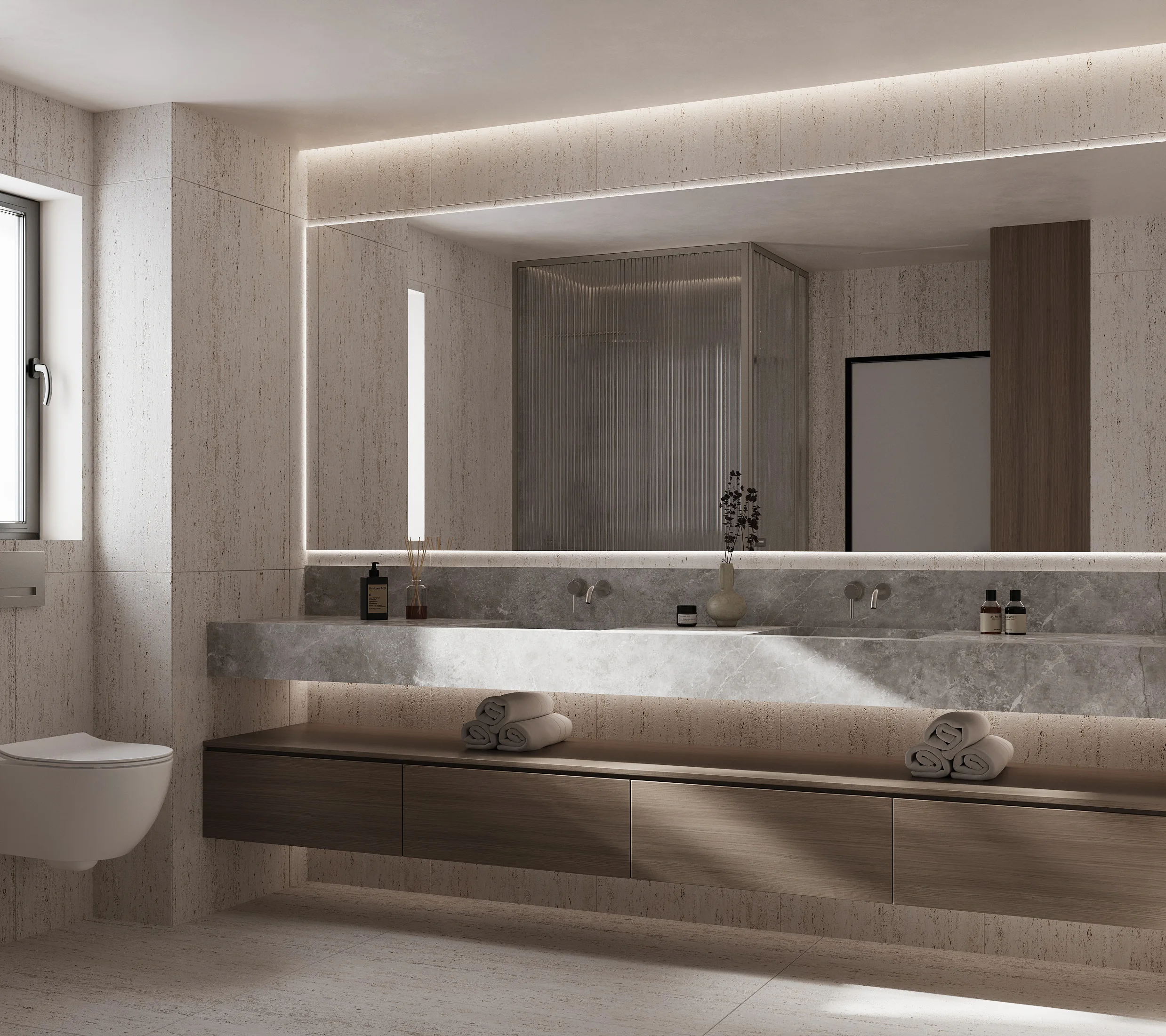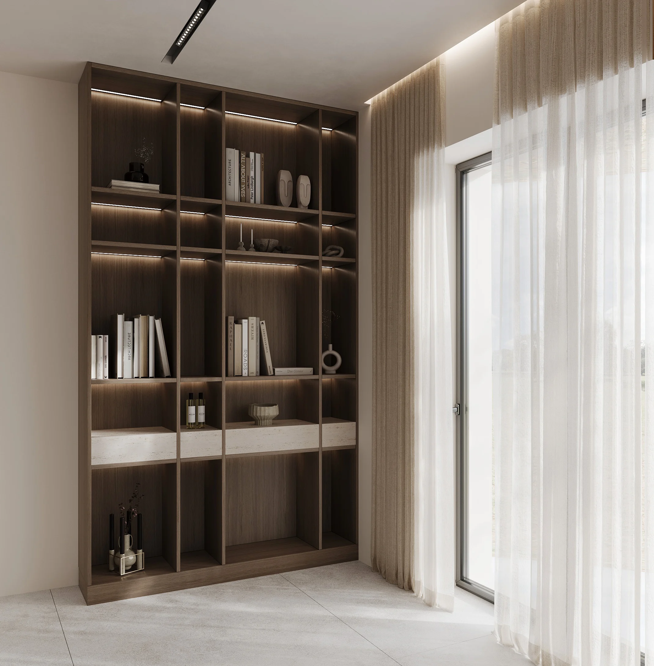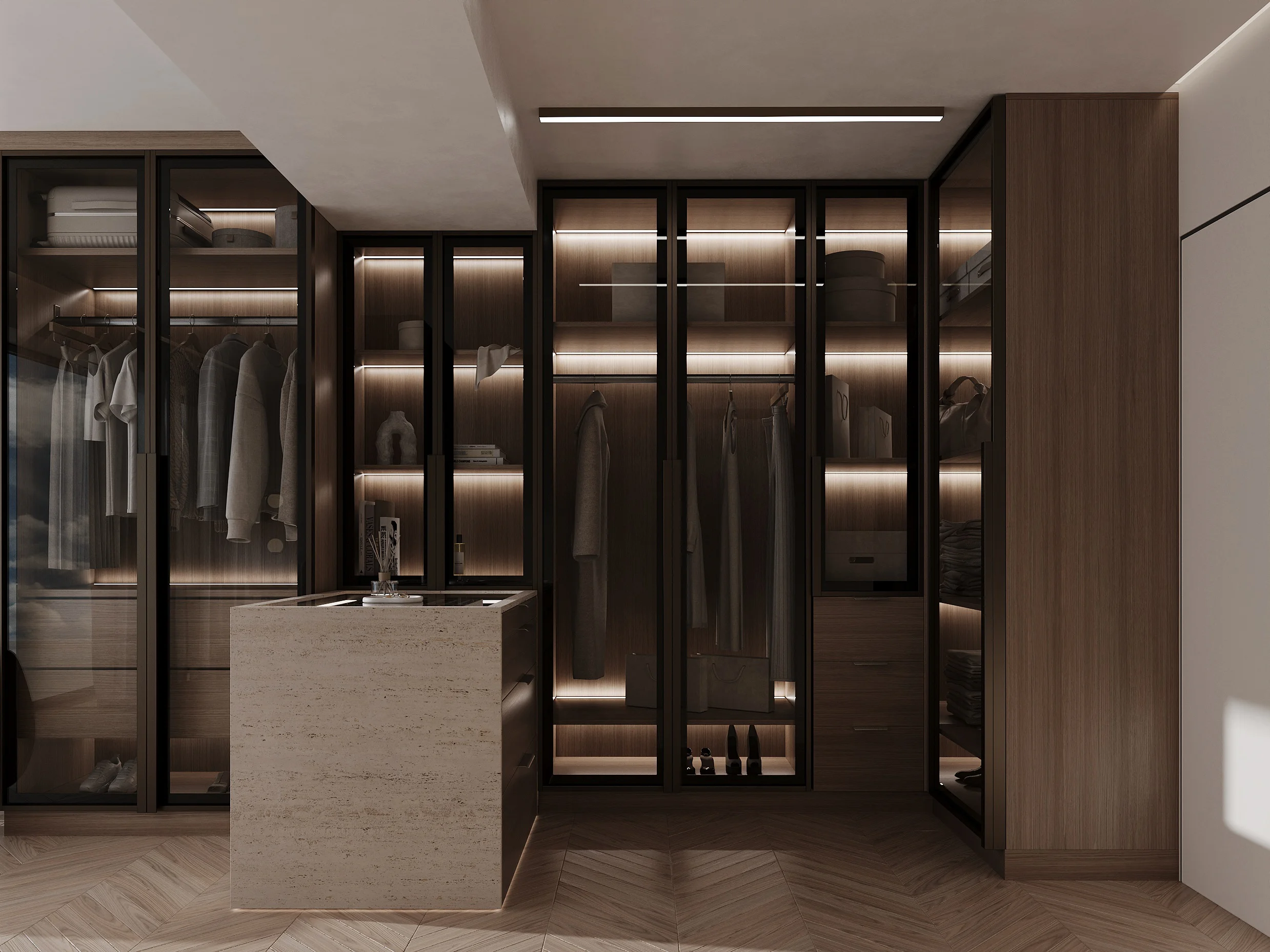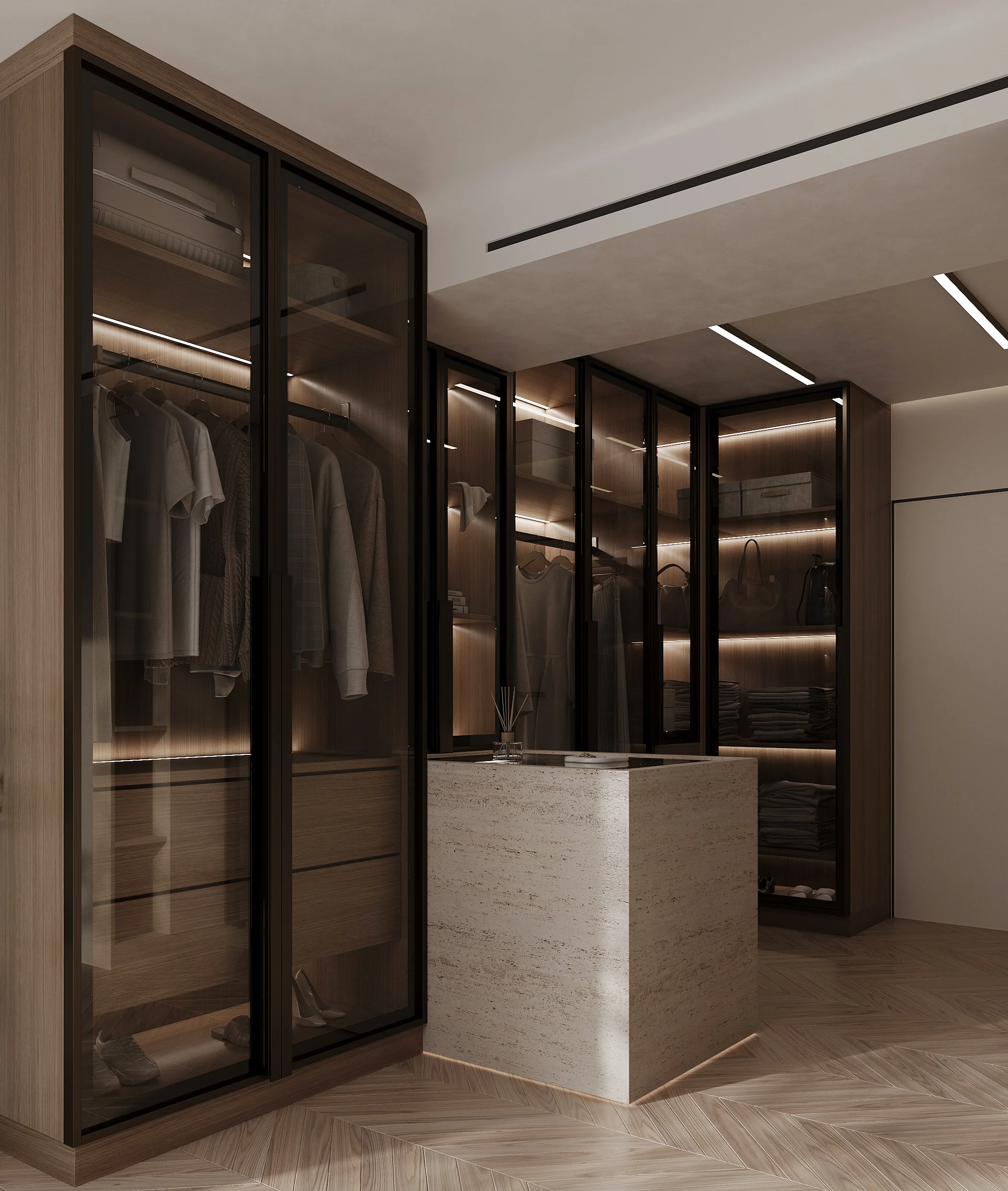 Κεντρικός άξονας του σχεδιασμού είναι οι custom κατασκευές: ενσωματωμένες ντουλάπες, βιβλιοθήκες με κρυφό φωτισμό, συνθέσεις TV wall, χώροι εργασίας μέσα στα υπνοδωμάτια και ένα πλήρως οργανωμένο walk-in closet με νησίδα και λεπτομέρειες αποθήκευσης υψηλής ακρίβειας. Στα μπάνια, οι υφές και τα υλικά κινούνται σε minimal αρχιτεκτονική λογική, με καθαρές γεωμετρίες, επιλεγμένα φωτιστικά και επιφάνειες που αναδεικνύουν το φως.