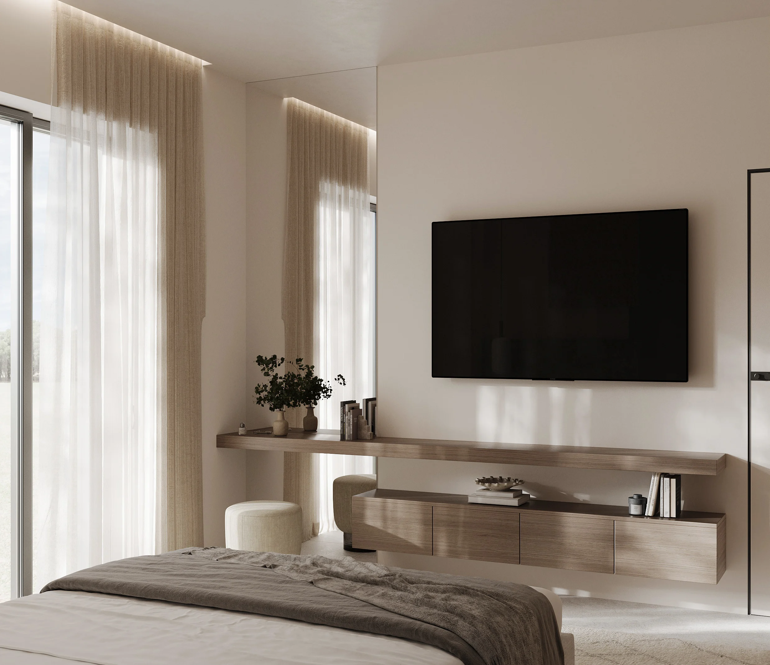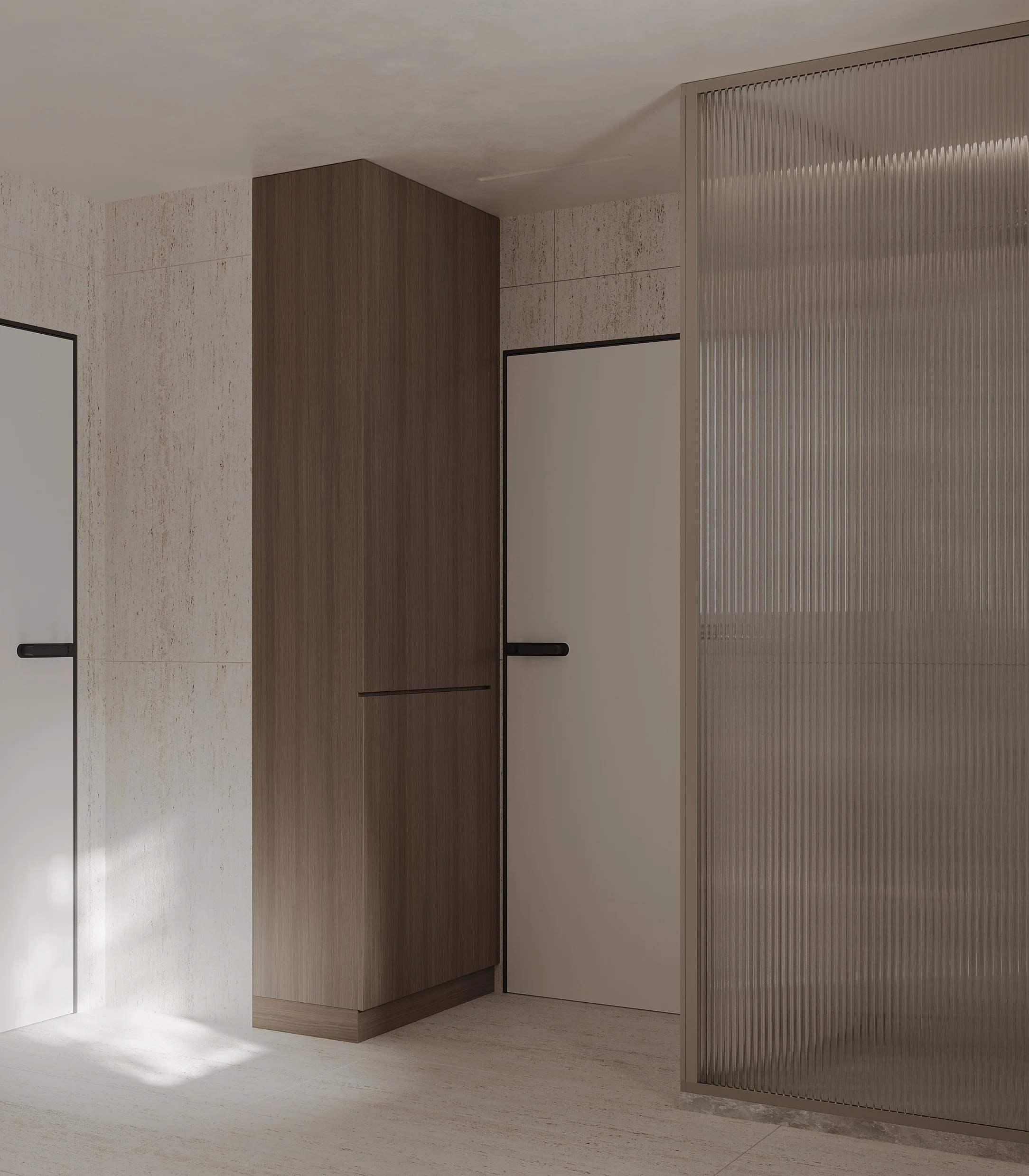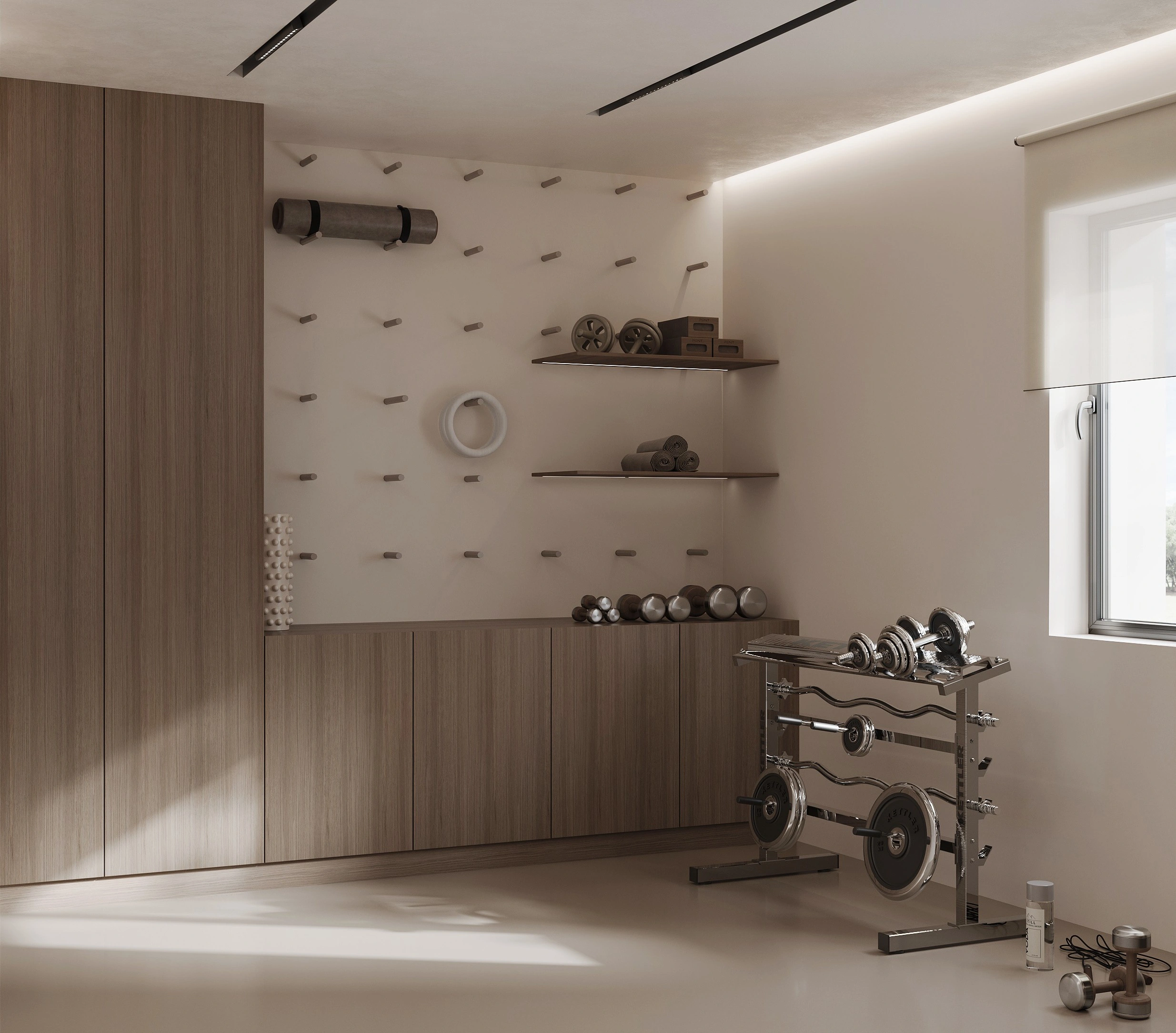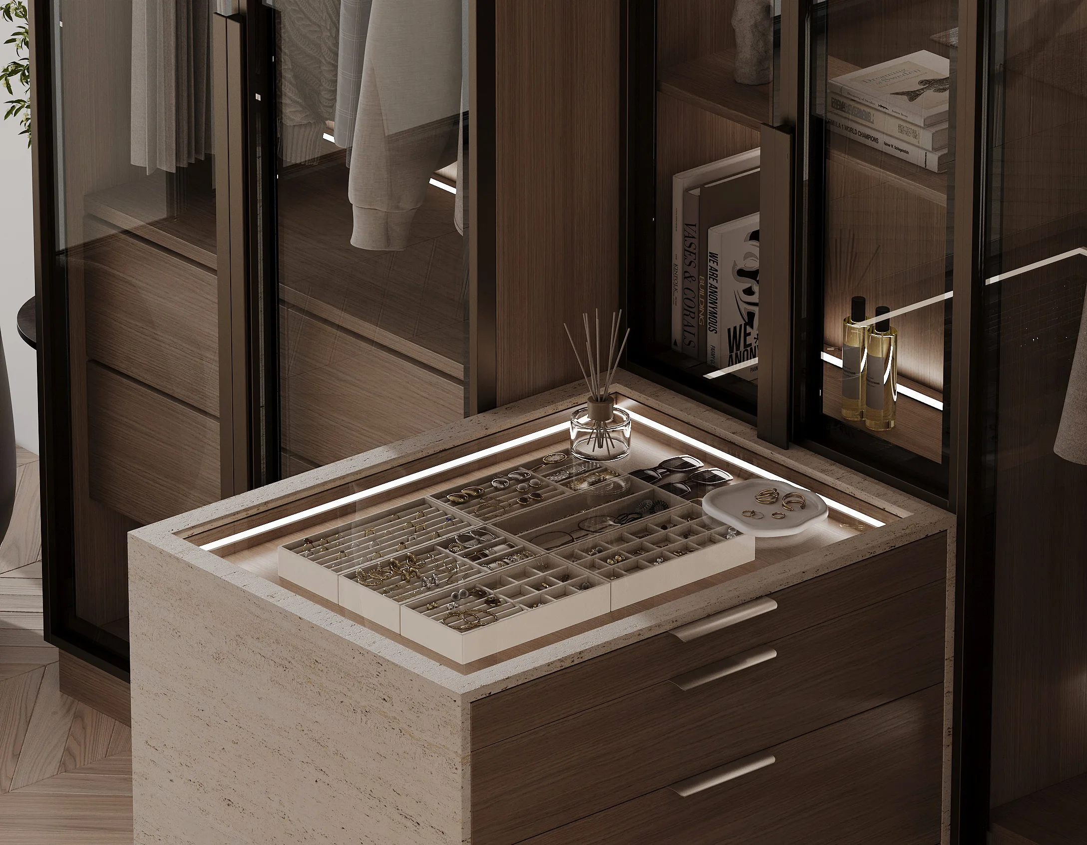 Κεντρικός άξονας του σχεδιασμού είναι οι custom κατασκευές: ενσωματωμένες ντουλάπες, βιβλιοθήκες με κρυφό φωτισμό, συνθέσεις TV wall, χώροι εργασίας μέσα στα υπνοδωμάτια και ένα πλήρως οργανωμένο walk-in closet με νησίδα και λεπτομέρειες αποθήκευσης υψηλής ακρίβειας. Στα μπάνια, οι υφές και τα υλικά κινούνται σε minimal αρχιτεκτονική λογική, με καθαρές γεωμετρίες, επιλεγμένα φωτιστικά και επιφάνειες που αναδεικνύουν το φως.
