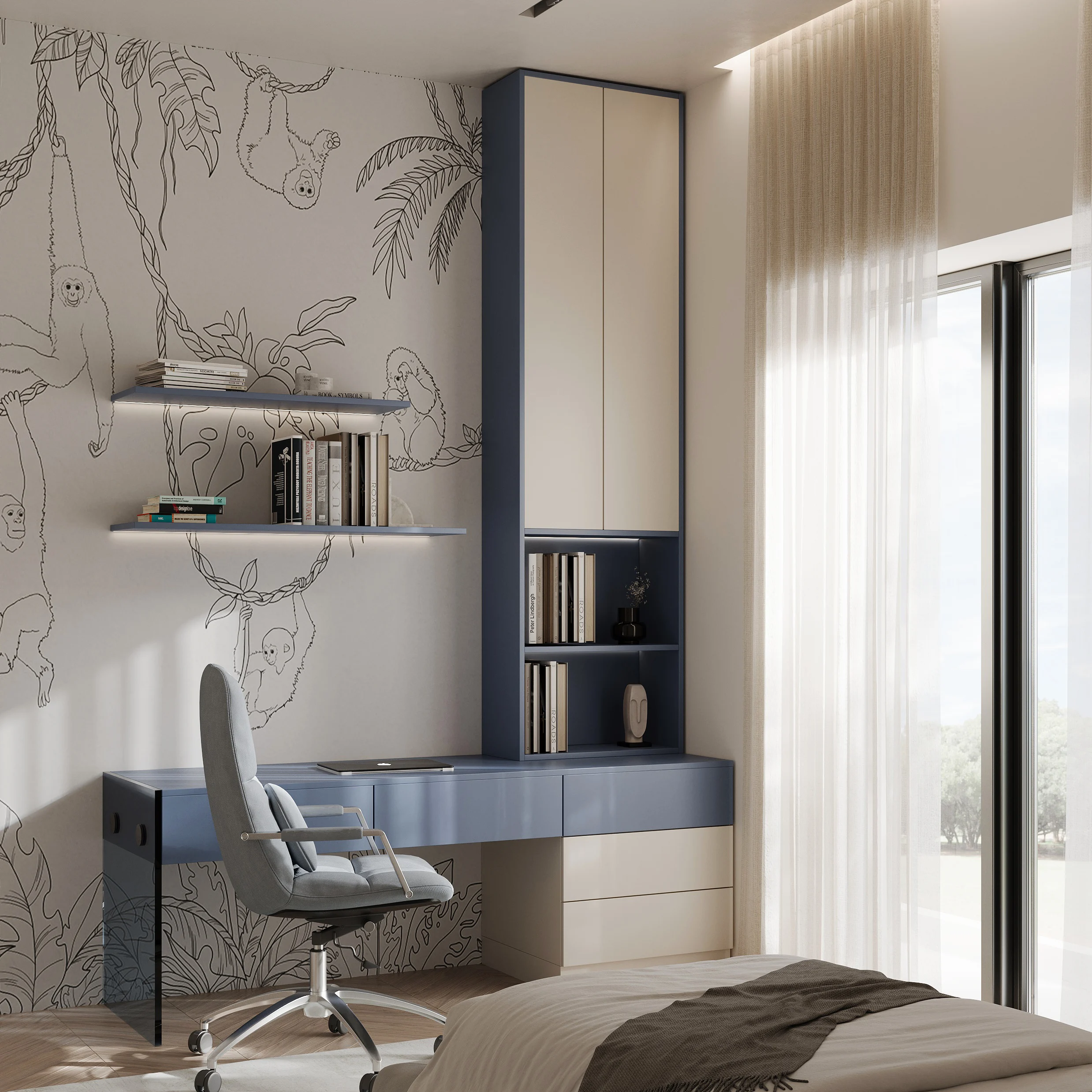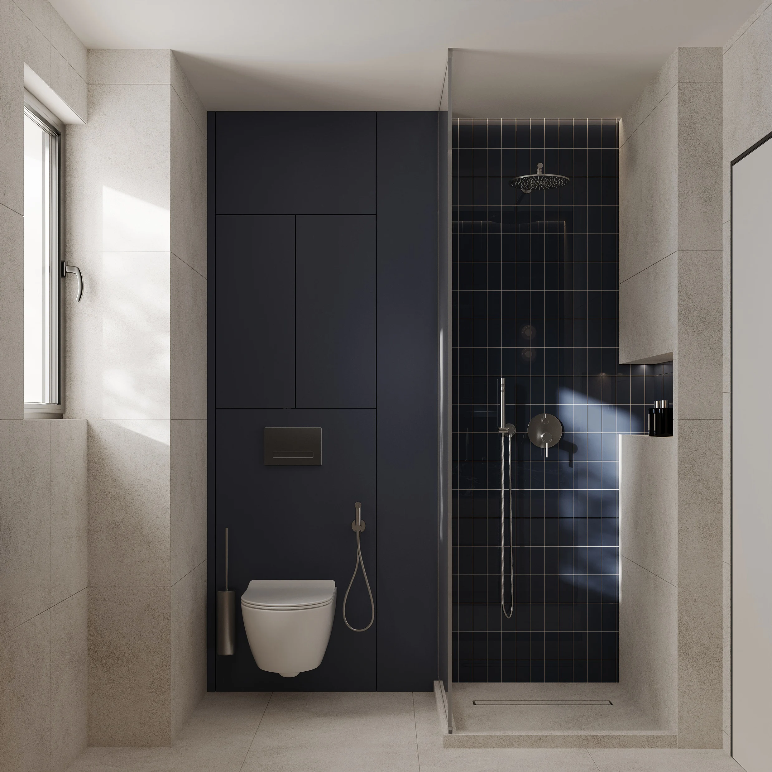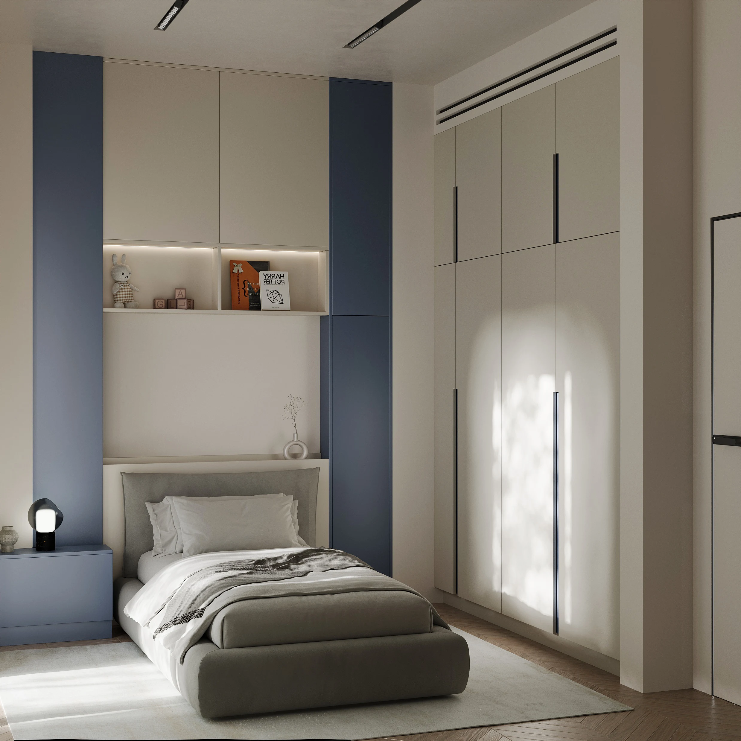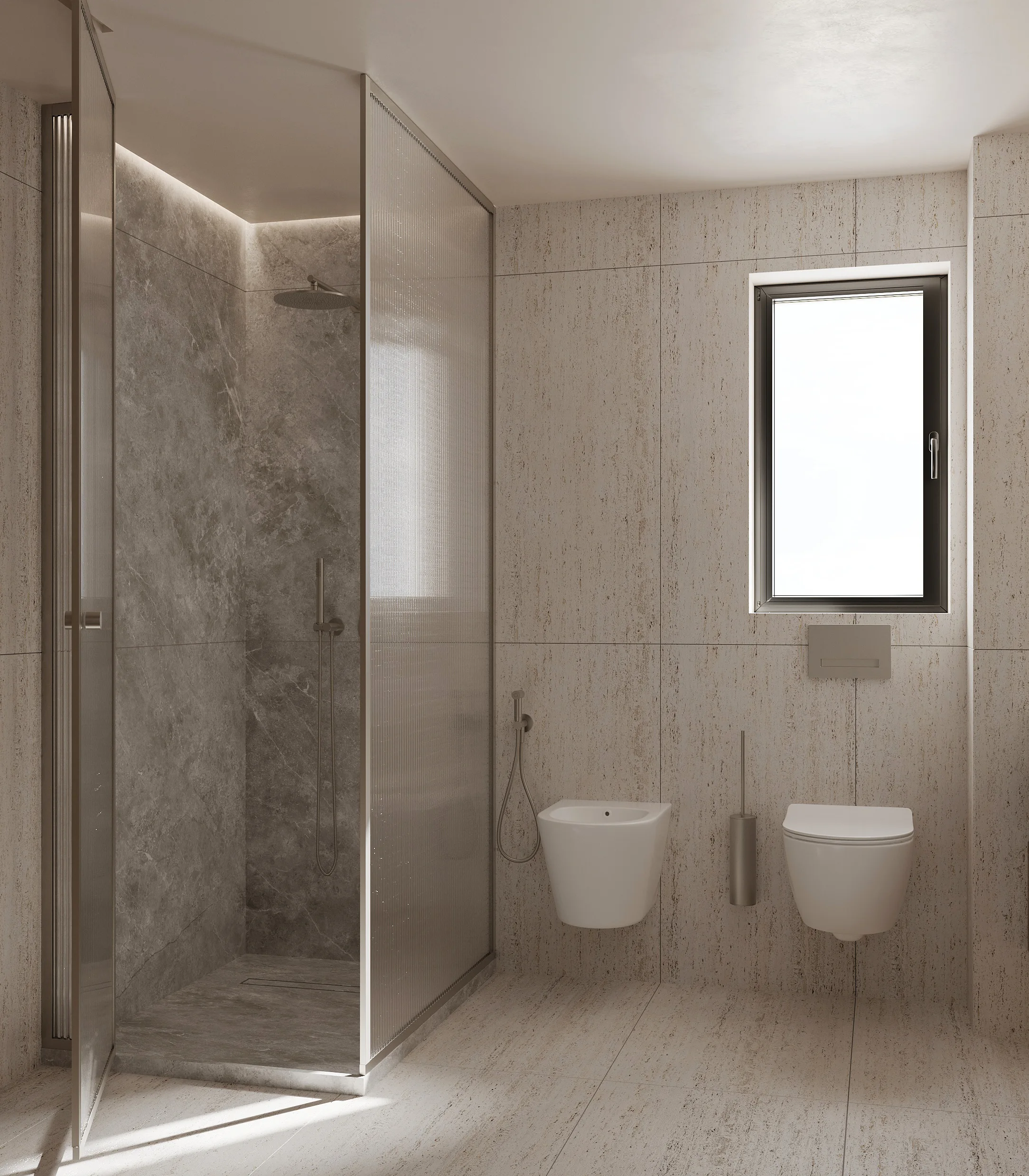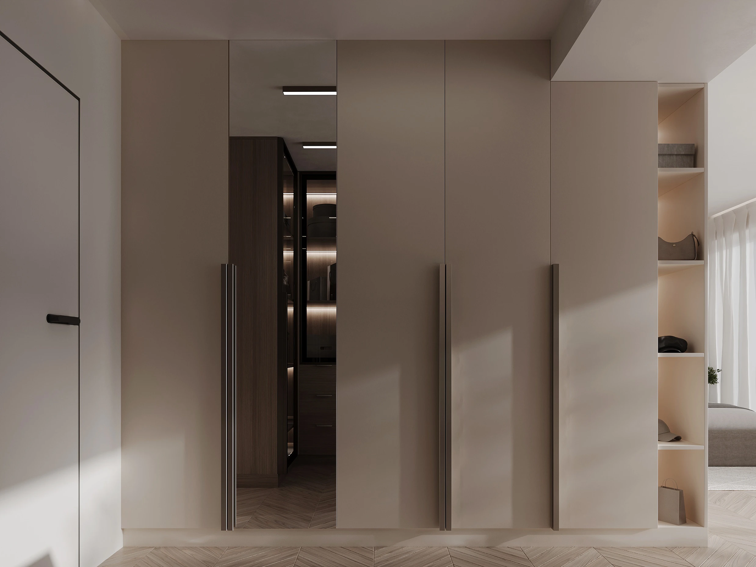 Κεντρικός άξονας του σχεδιασμού είναι οι custom κατασκευές: ενσωματωμένες ντουλάπες, βιβλιοθήκες με κρυφό φωτισμό, συνθέσεις TV wall, χώροι εργασίας μέσα στα υπνοδωμάτια και ένα πλήρως οργανωμένο walk-in closet με νησίδα και λεπτομέρειες αποθήκευσης υψηλής ακρίβειας. Στα μπάνια, οι υφές και τα υλικά κινούνται σε minimal αρχιτεκτονική λογική, με καθαρές γεωμετρίες, επιλεγμένα φωτιστικά και επιφάνειες που αναδεικνύουν το φως.