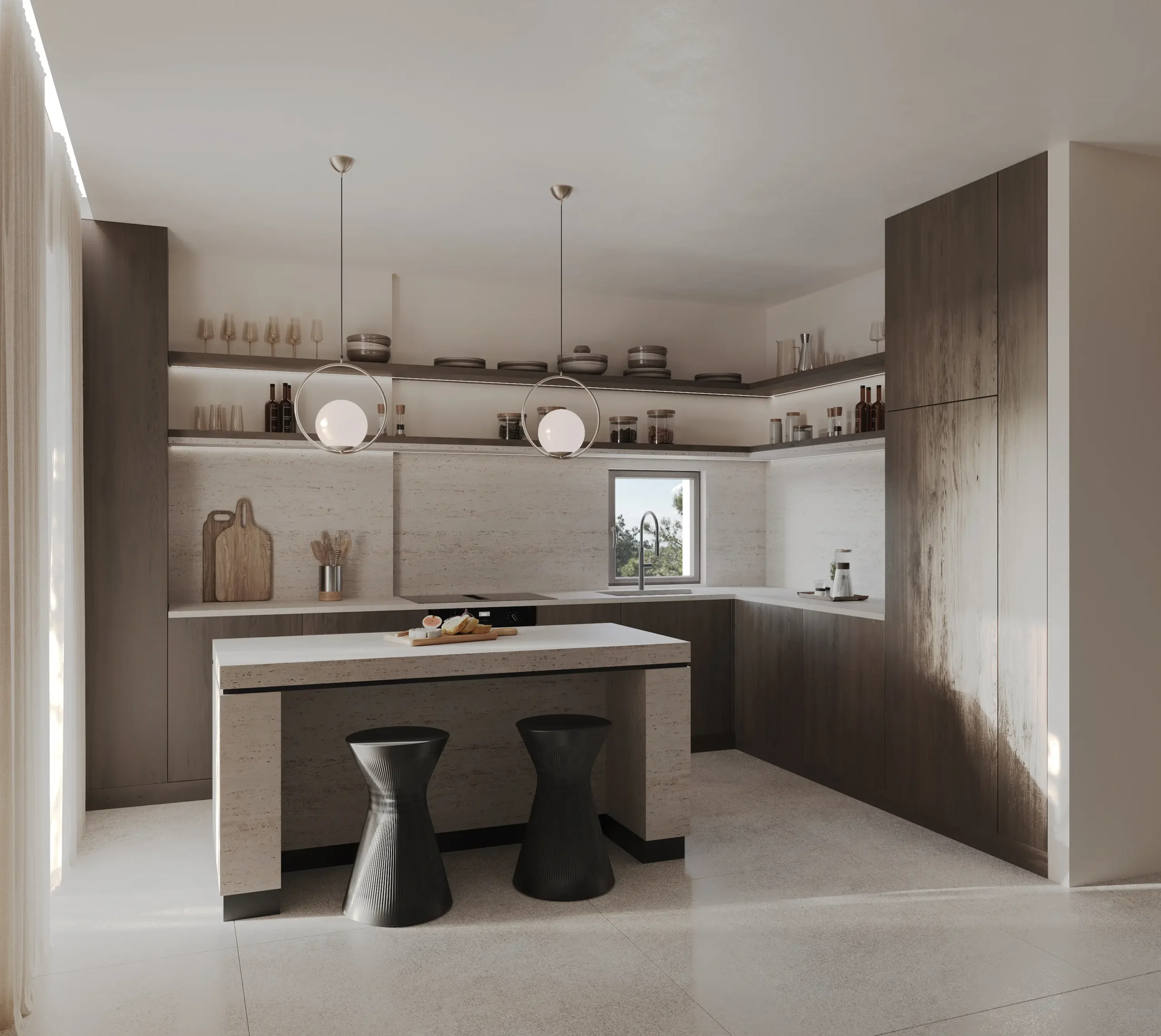 Στην απεικόνιση της Villa E, δίνεται ιδιαίτερη έμφαση στις καθαρές γραμμές της σύγχρονης αρχιτεκτονικής, στην αρμονική σύνθεση ξύλινων και λευκών επιφανειών, καθώς και στη ρεαλιστική απόδοση των εσωτερικών χώρων που συνδυάζουν λειτουργικότητα με αισθητική άνεση. Τα φωτορεαλιστικά 3D σχέδια παρουσιάζουν την κουζίνα με προσεκτικά επιλεγμένα υλικά και φωτισμό, τις καθαρές γεωμετρίες των καθιστικών και υπνοδωματίων, καθώς και τους χώρους υγιεινής με minimal αισθητική και υψηλή πιστότητα απεικόνισης υφών και λεπτομερειών.