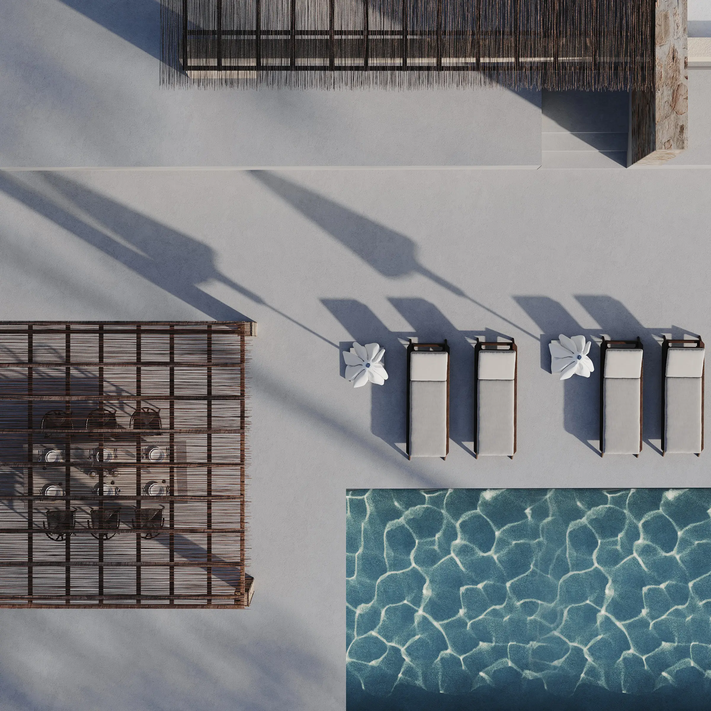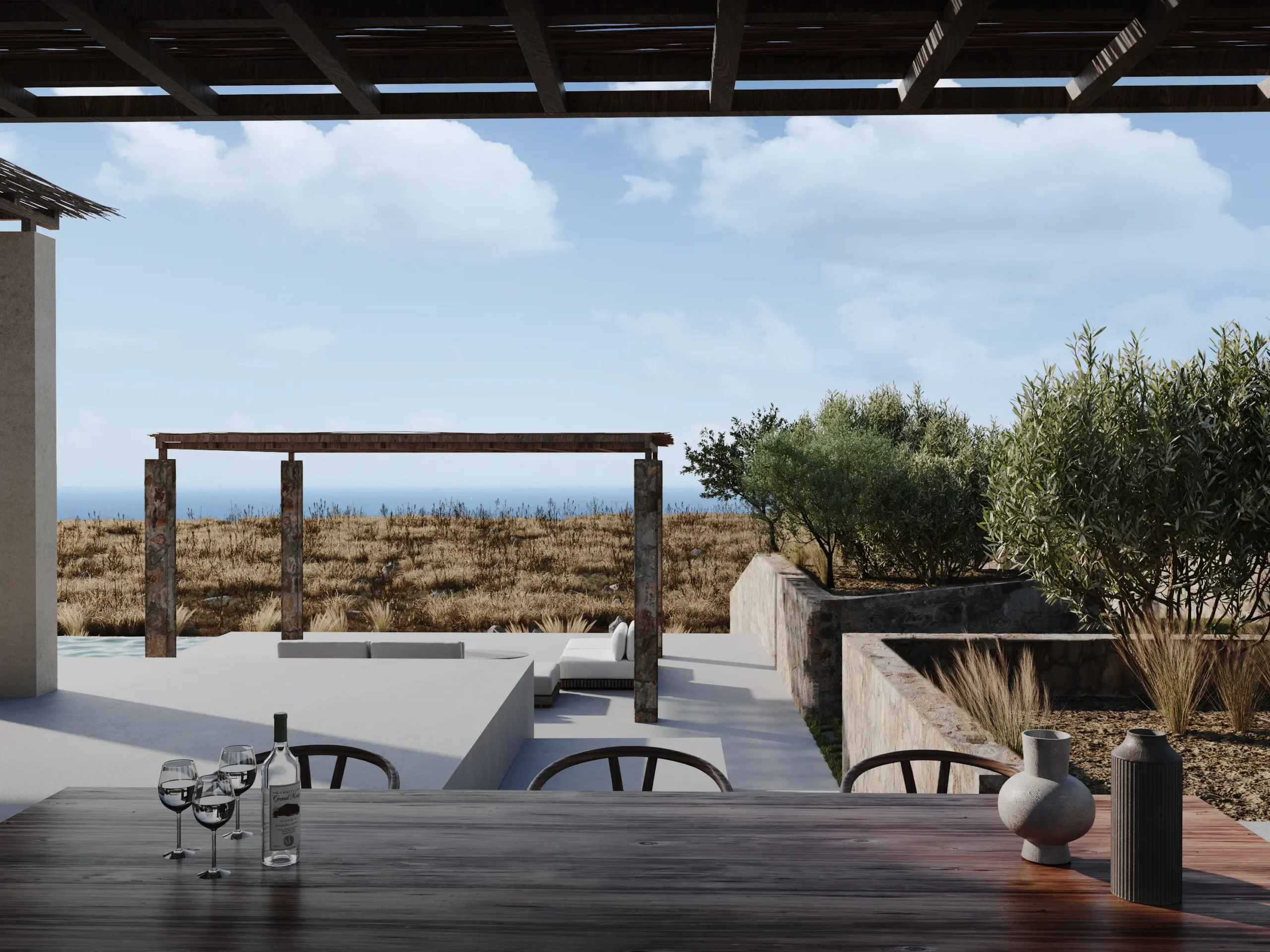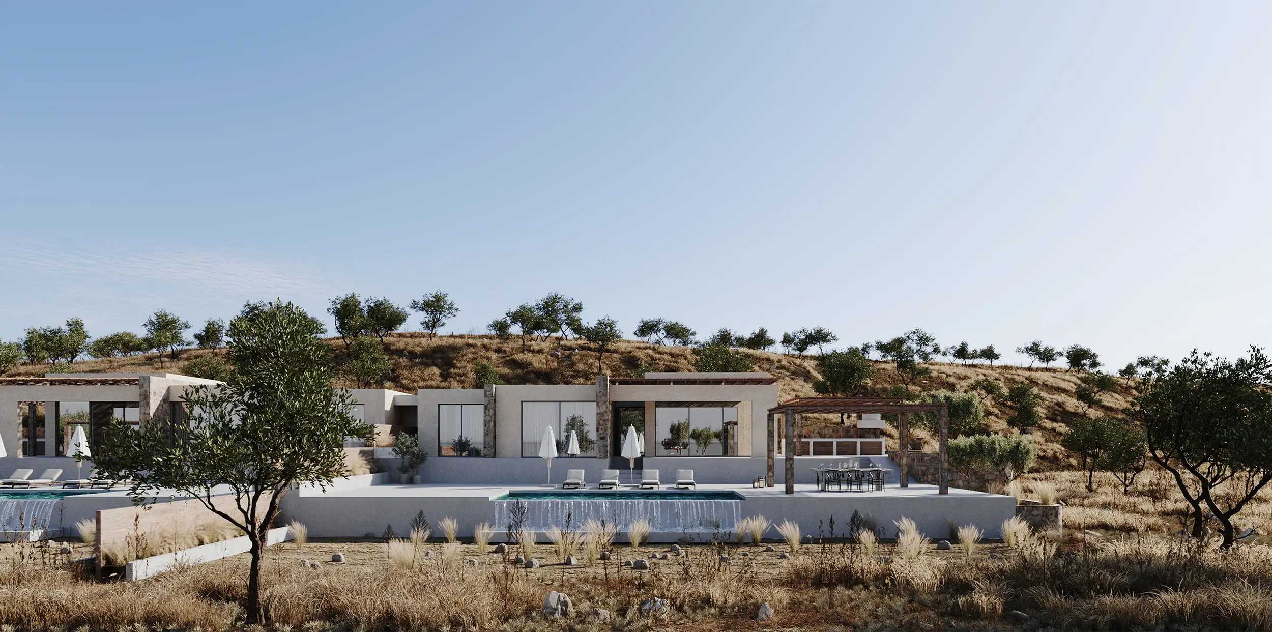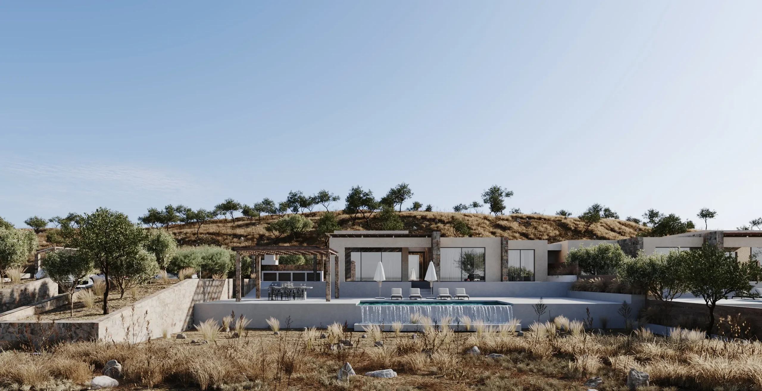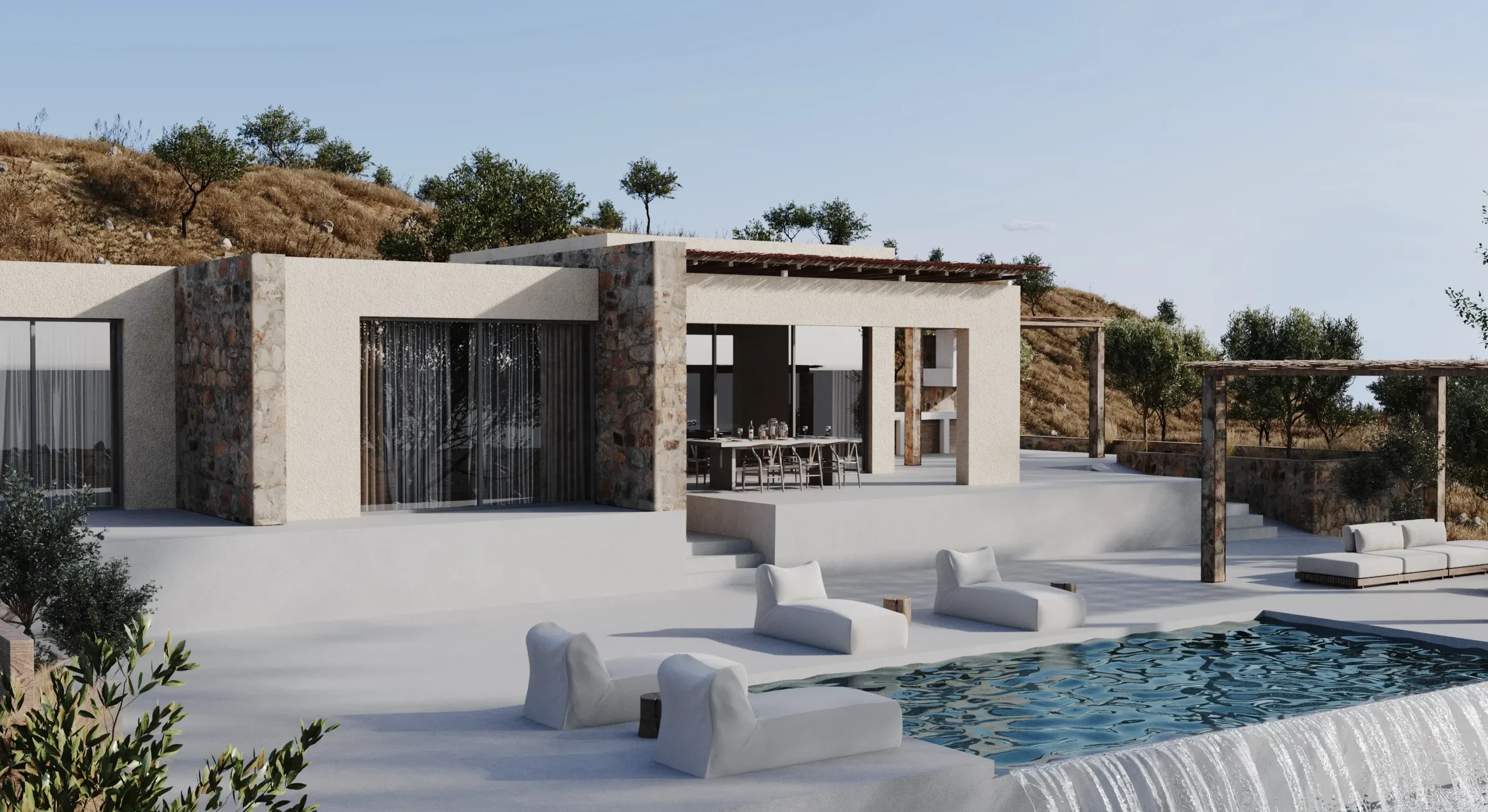 Οι υπαίθριες ζώνες διαβίωσης σχεδιάζονται ως φυσική προέκταση των εσωτερικών χώρων, με έμφαση στη σκίαση, τη ροή αέρα και τη δροσιά του νερού. Η εμπειρία κατοίκησης ολοκληρώνεται μέσα από μια ισορροπία ανάμεσα στην άνεση και την απλότητα: ένα ήσυχο, λειτουργικό και αισθητικά συνεκτικό καταφύγιο που εναρμονίζεται πλήρως με το μεσογειακό περιβάλλον της Κρήτης.