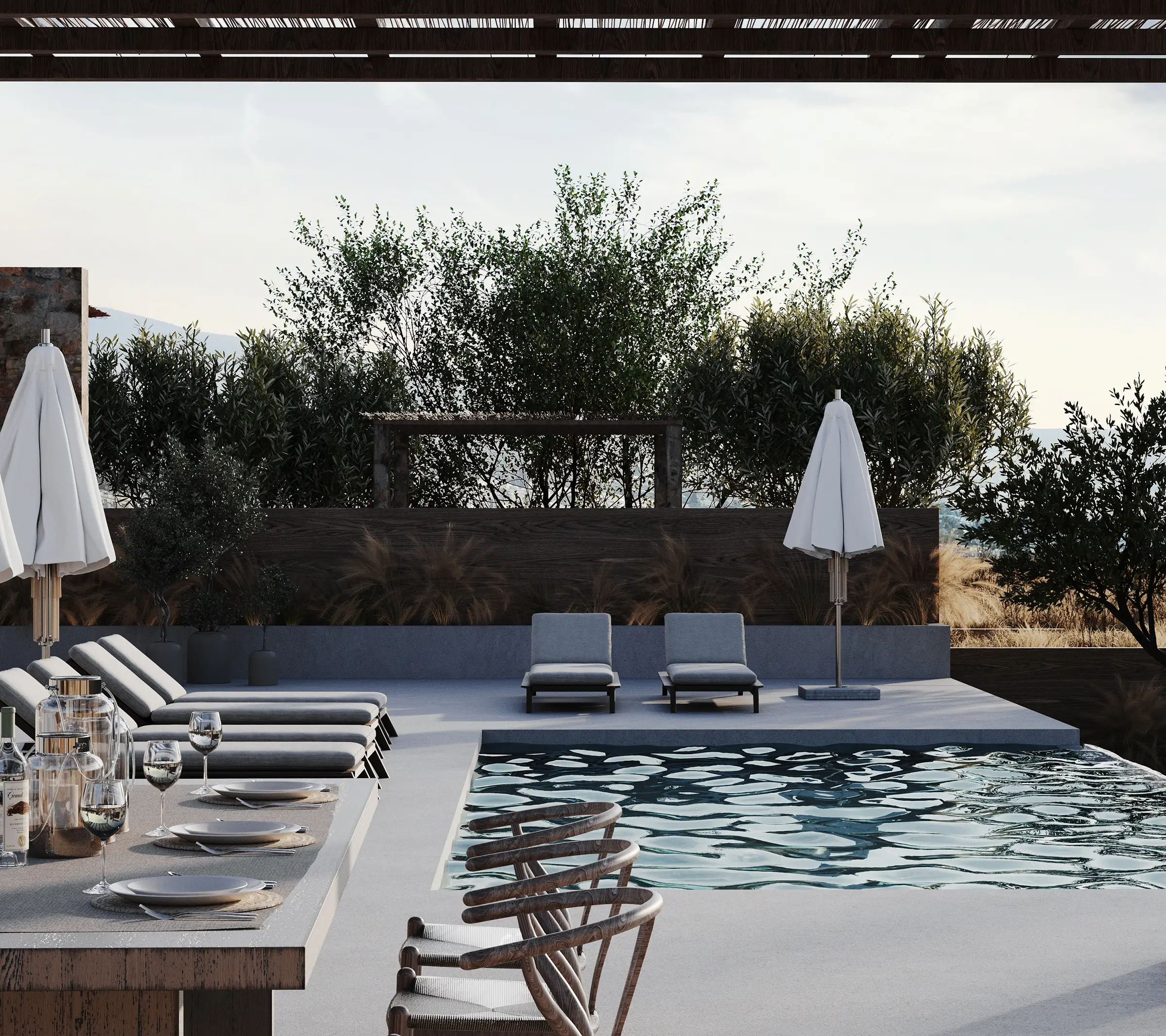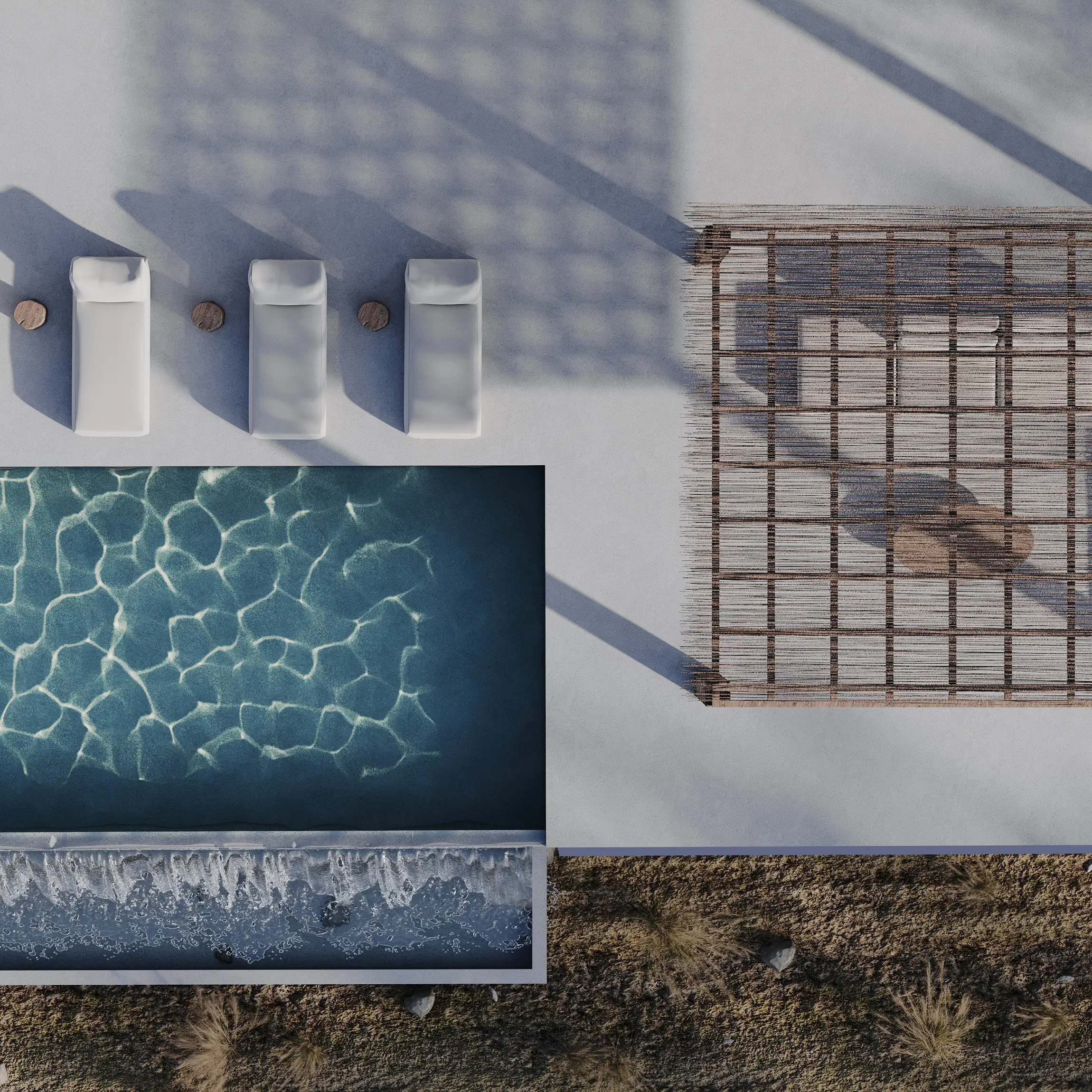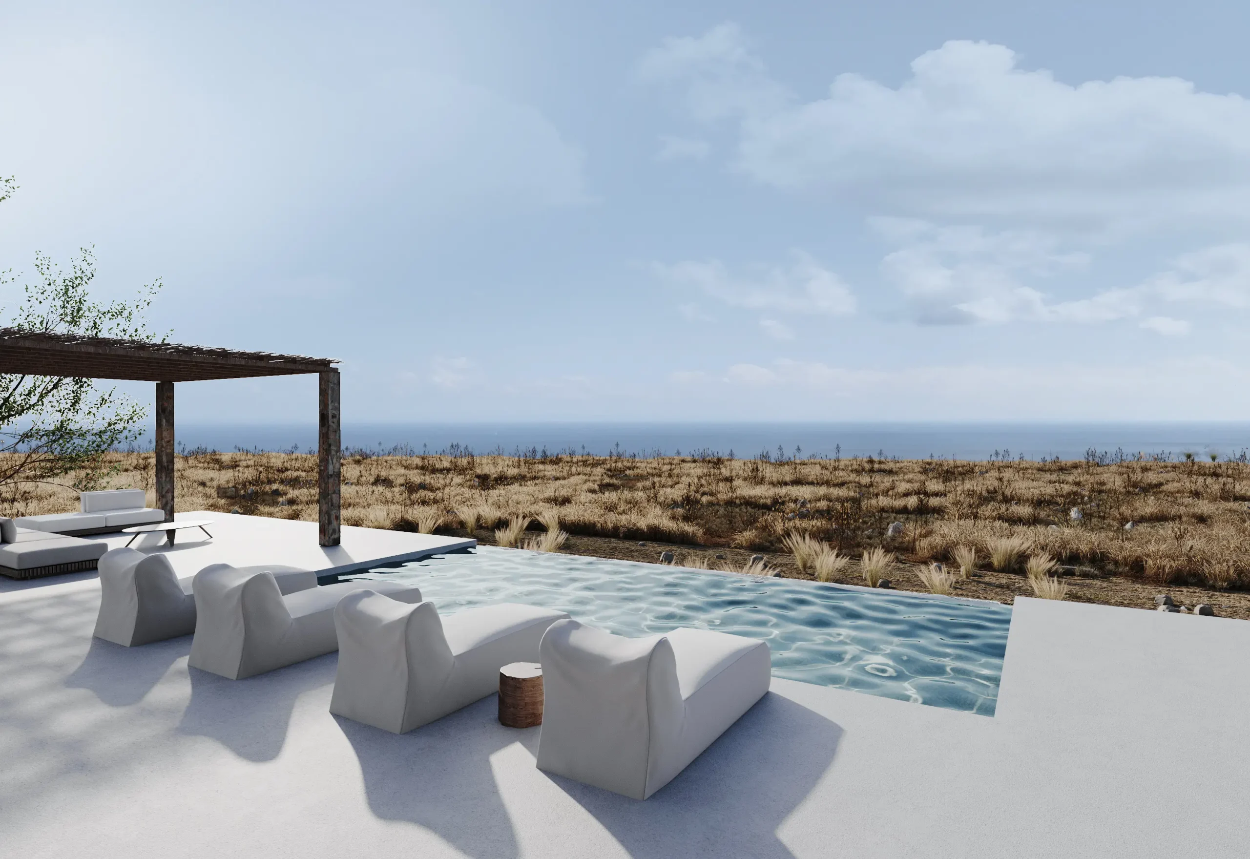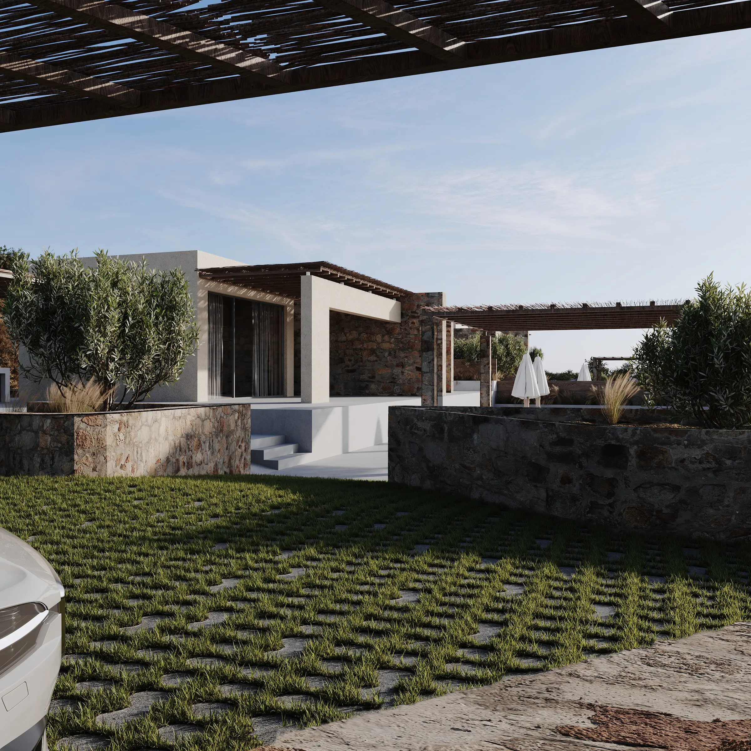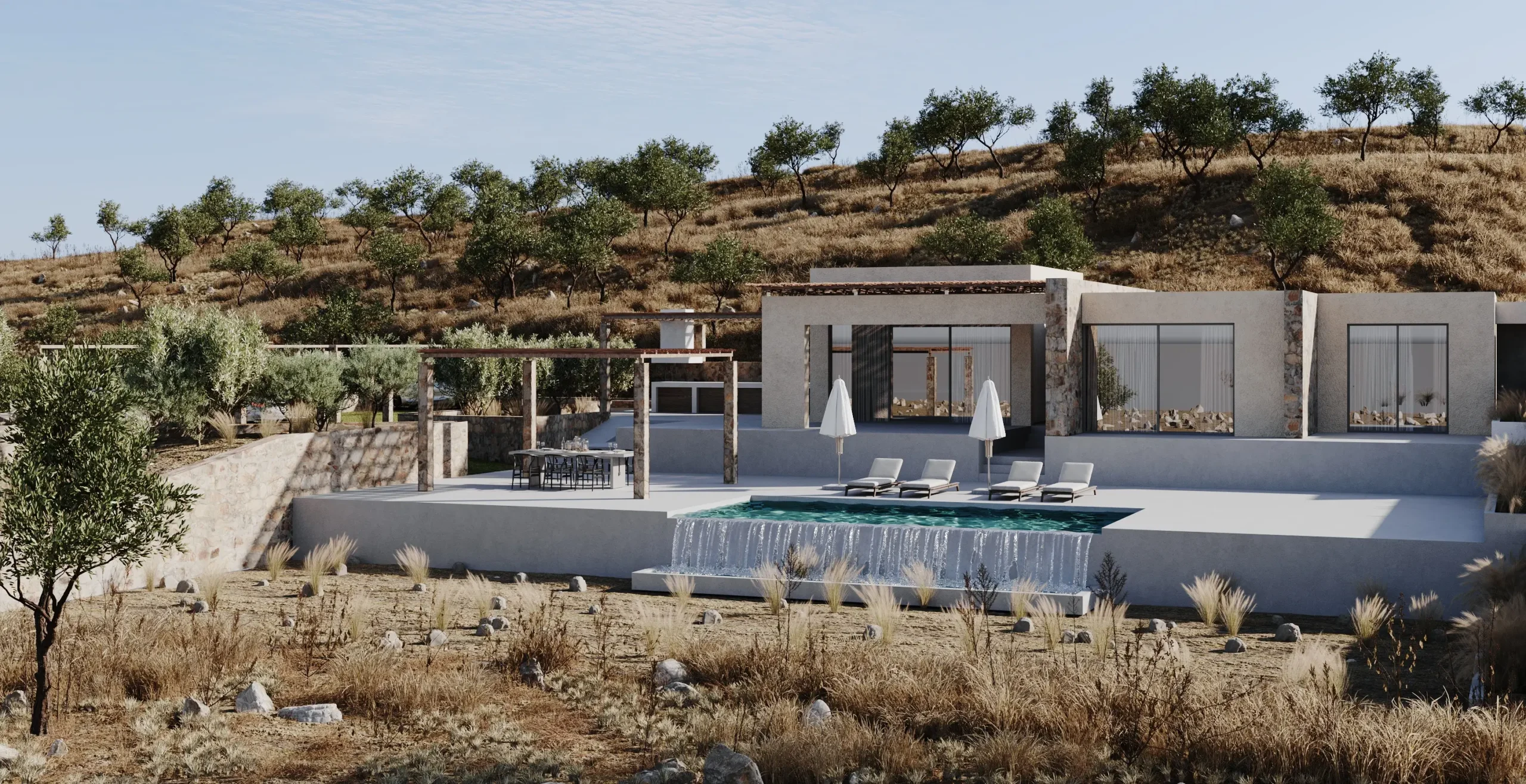 Οι υπαίθριες ζώνες διαβίωσης σχεδιάζονται ως φυσική προέκταση των εσωτερικών χώρων, με έμφαση στη σκίαση, τη ροή αέρα και τη δροσιά του νερού. Η εμπειρία κατοίκησης ολοκληρώνεται μέσα από μια ισορροπία ανάμεσα στην άνεση και την απλότητα: ένα ήσυχο, λειτουργικό και αισθητικά συνεκτικό καταφύγιο που εναρμονίζεται πλήρως με το μεσογειακό περιβάλλον της Κρήτης.