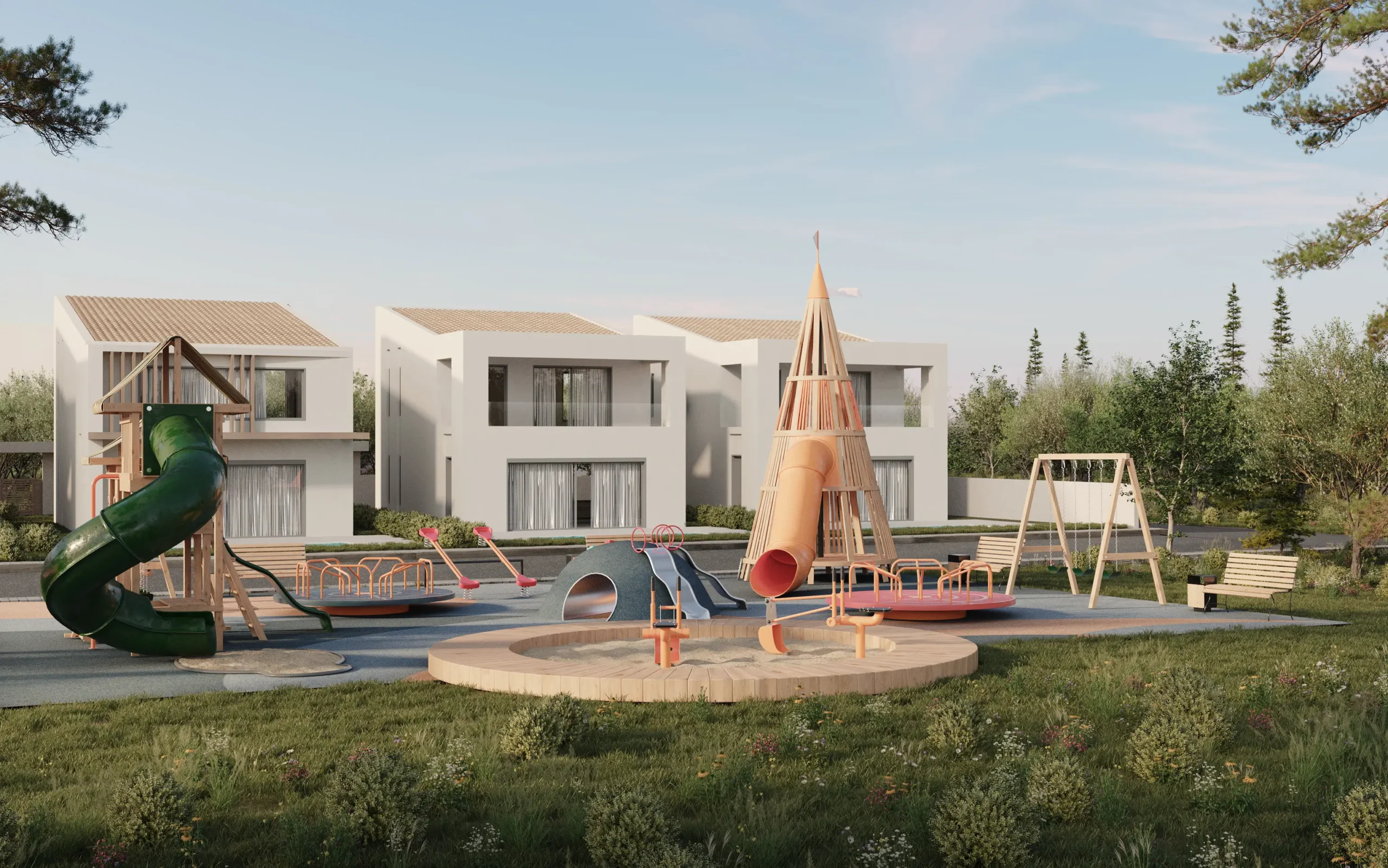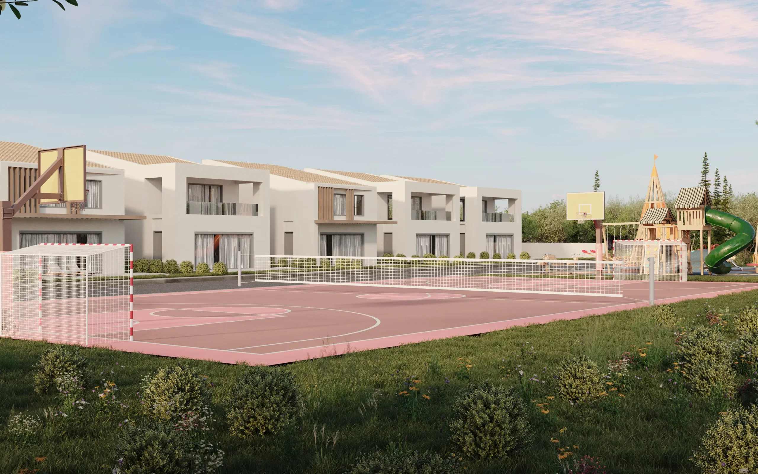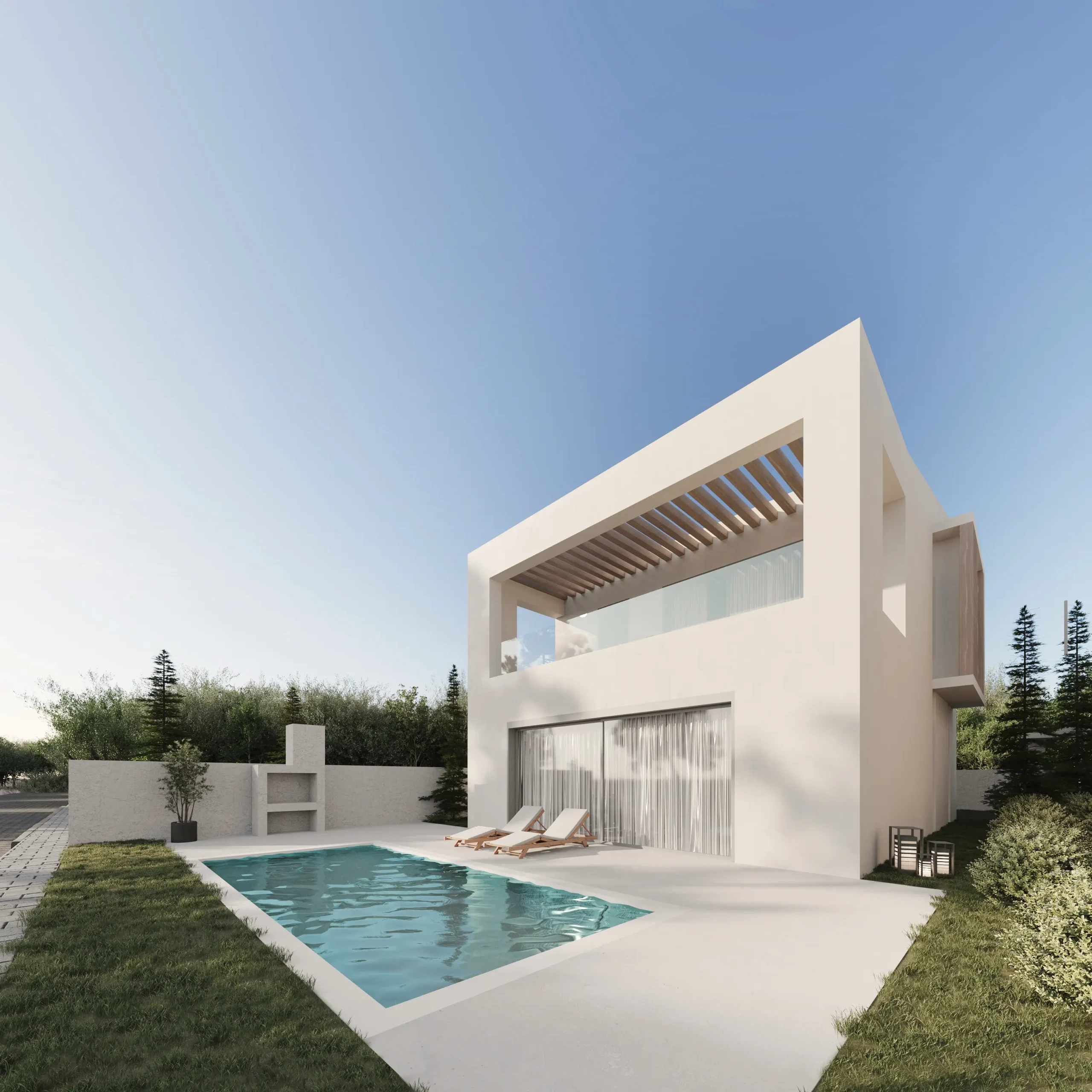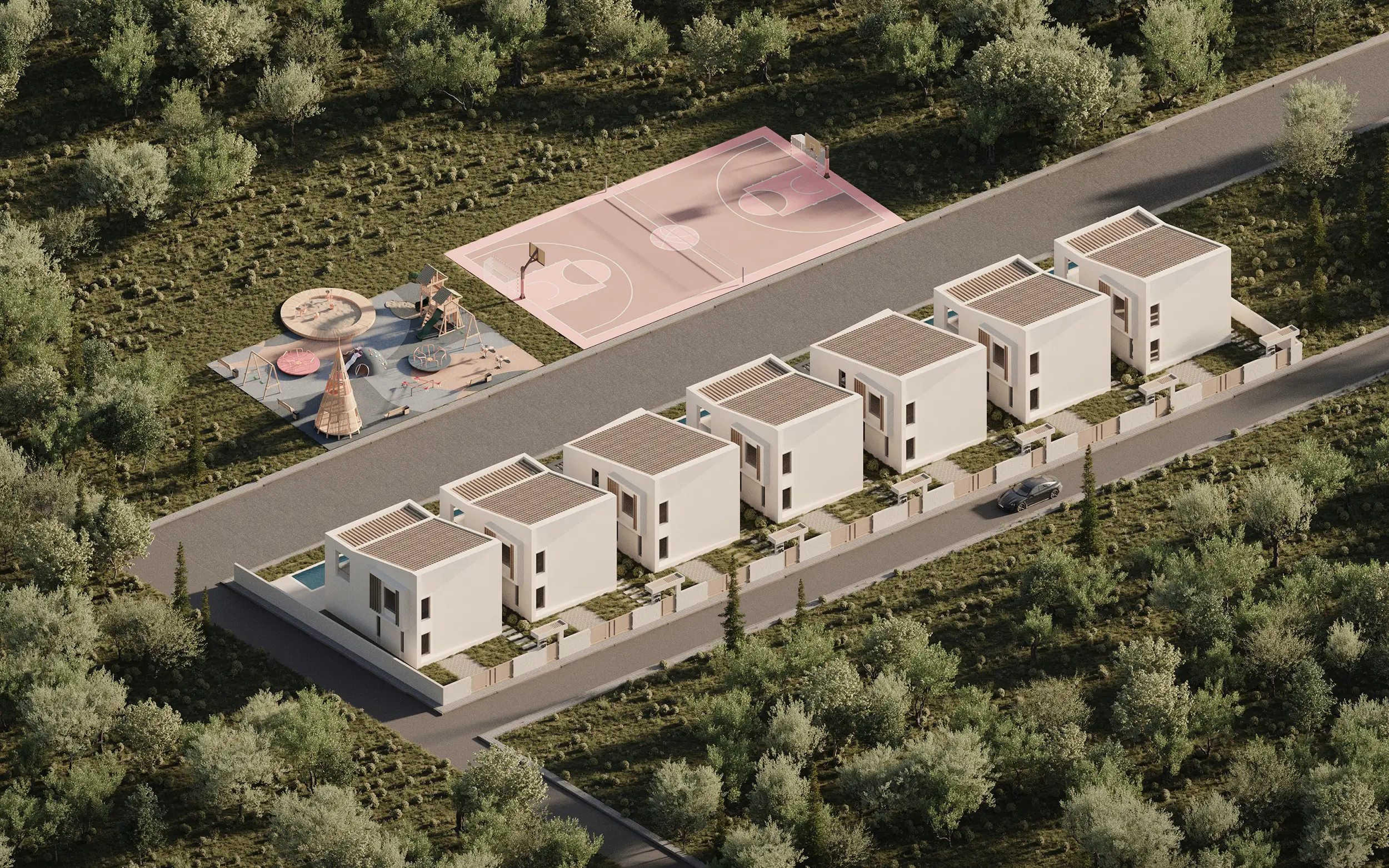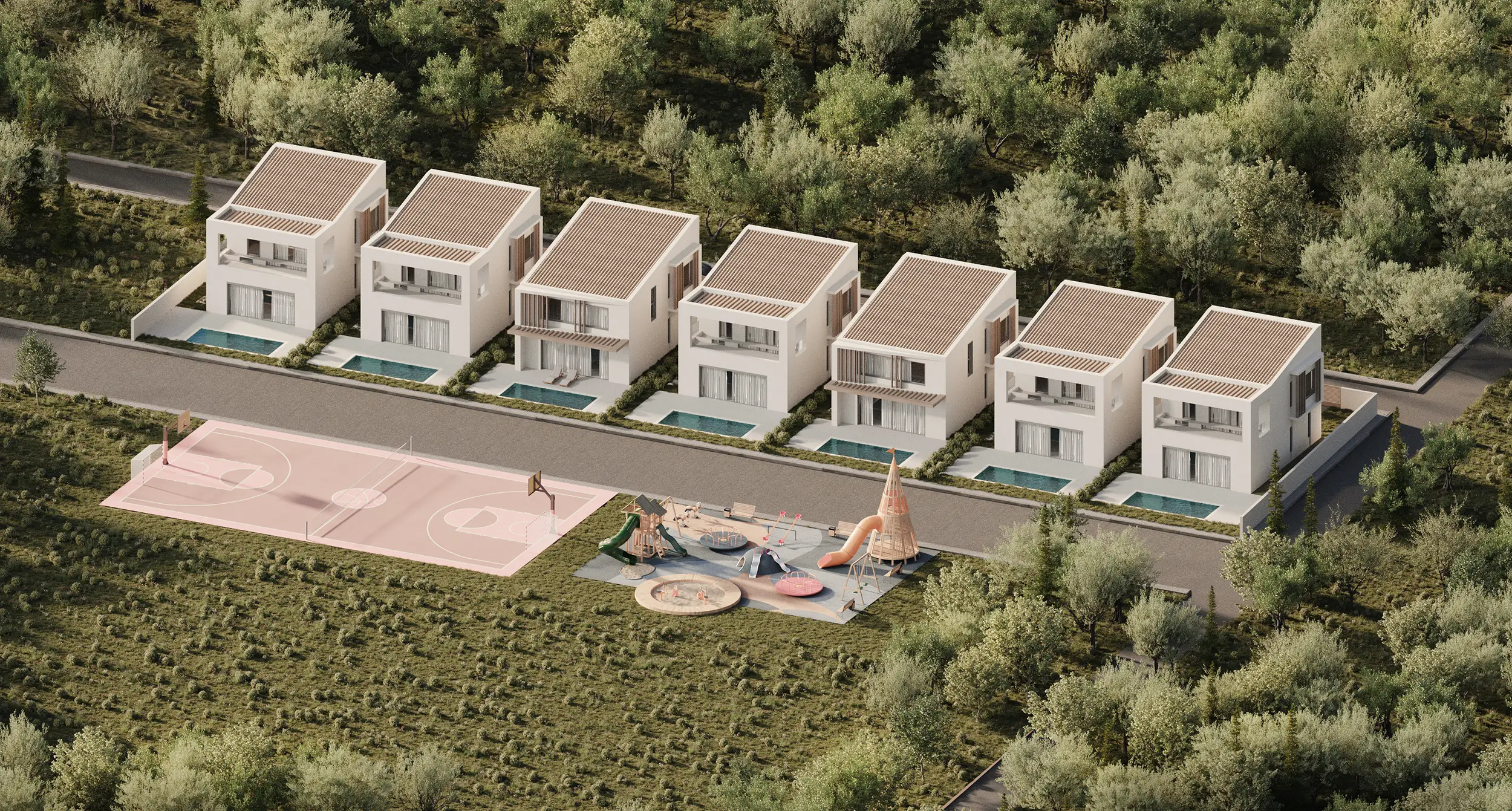 Οι όψεις συνθέτονται από σοβά σε γήινες αποχρώσεις, υφή ξύλου και τη διαφάνεια του γυαλιού, σε μια ισορροπία πλήρων και κενών που ενισχύει το φυσικό φως και την αίσθηση άνεσης. Μπροστά από την κύρια όψη κάθε κατοικίας αναπτύσσεται ιδιωτική κολυμβητική δεξαμενή, ενώ οι κοινόχρηστες παρεμβάσεις (όπως αθλητικός χώρος και παιδότοπος) λειτουργούν ως ήπιες “νησίδες” δραστηριότητας μέσα στο πράσινο, αναβαθμίζοντας τη συνολική εμπειρία διαμονής.Το αποτέλεσμα συνδυάζει μοντερνισμό, λειτουργικότητα και φυσικό κάλλος, προσφέροντας ένα συνεκτικό, ποιοτικό σύνολο εξοχικών κατοικιών με έντονο χαρακτήρα και ξεκάθαρη αρχιτεκτονική πρόθεση.